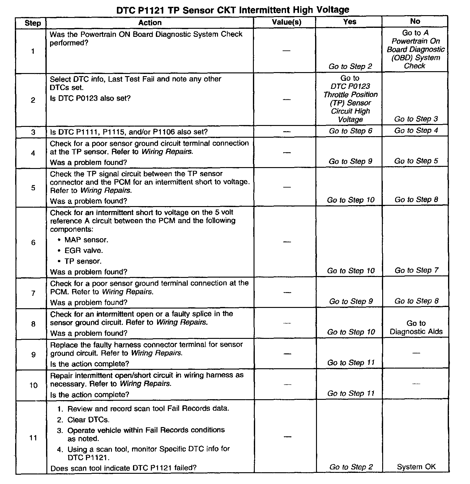The Throttle Position (TP) sensor circuit provides a voltage signal that changes relative to throttle blade angle. The signal voltage will vary from 1 volt at closed throttle to 4 volts at Wide Open Throttle (WOT). The TP signal is one of the most important inputs used by the PCM for fuel control and most of the PCM controlled outputs. If the PCM detects a TP signal that is intermittently above the range of the TP sensor, DTC P1121 will be set.