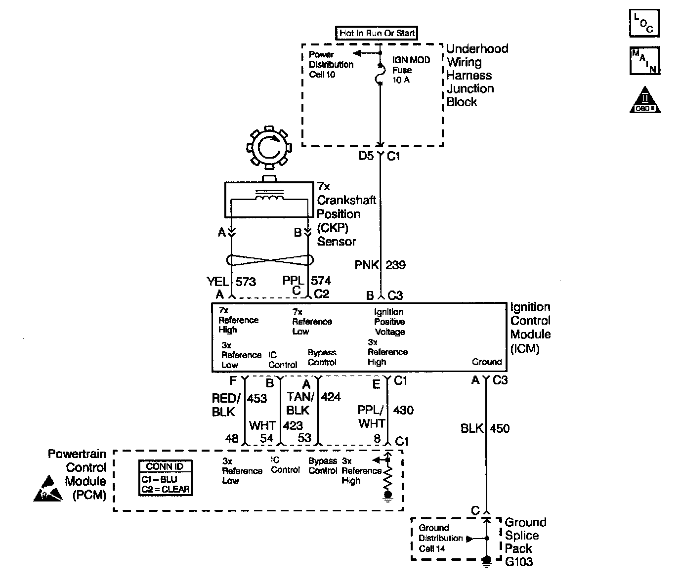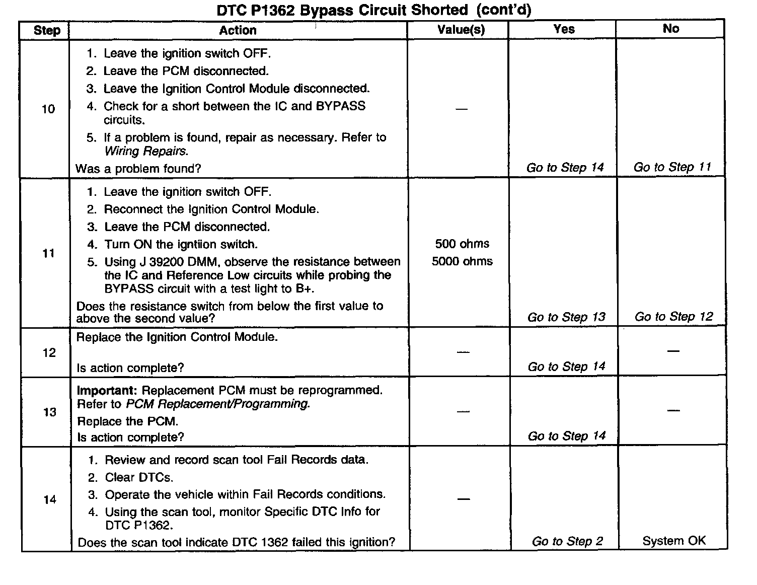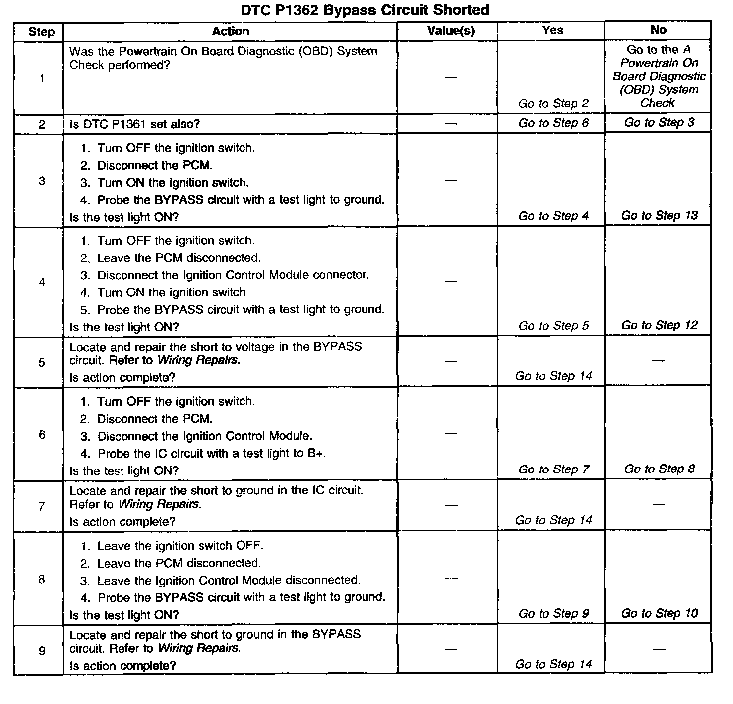 The Ignition Control (IC) Module sends signals that the PCM requires for fuel control and spark advance calculations. At the start of engine crank, the IC Module controls spark advance (Bypass mode.) When the second 3X reference pulse is recognized by the PCM, the PCM applies 5 volts to the Bypass circuit, commanding the IC Module to switch spark advance to PCM control (IC mode). If the PCM detects a short to voltage in the Bypass circuit, DTC P1362 will set. A short to ground in the IC circuit or Bypass circuit will cause both DTC P1361 and DTC P1362 to set. The engine will start and may run in Bypass mode timing.