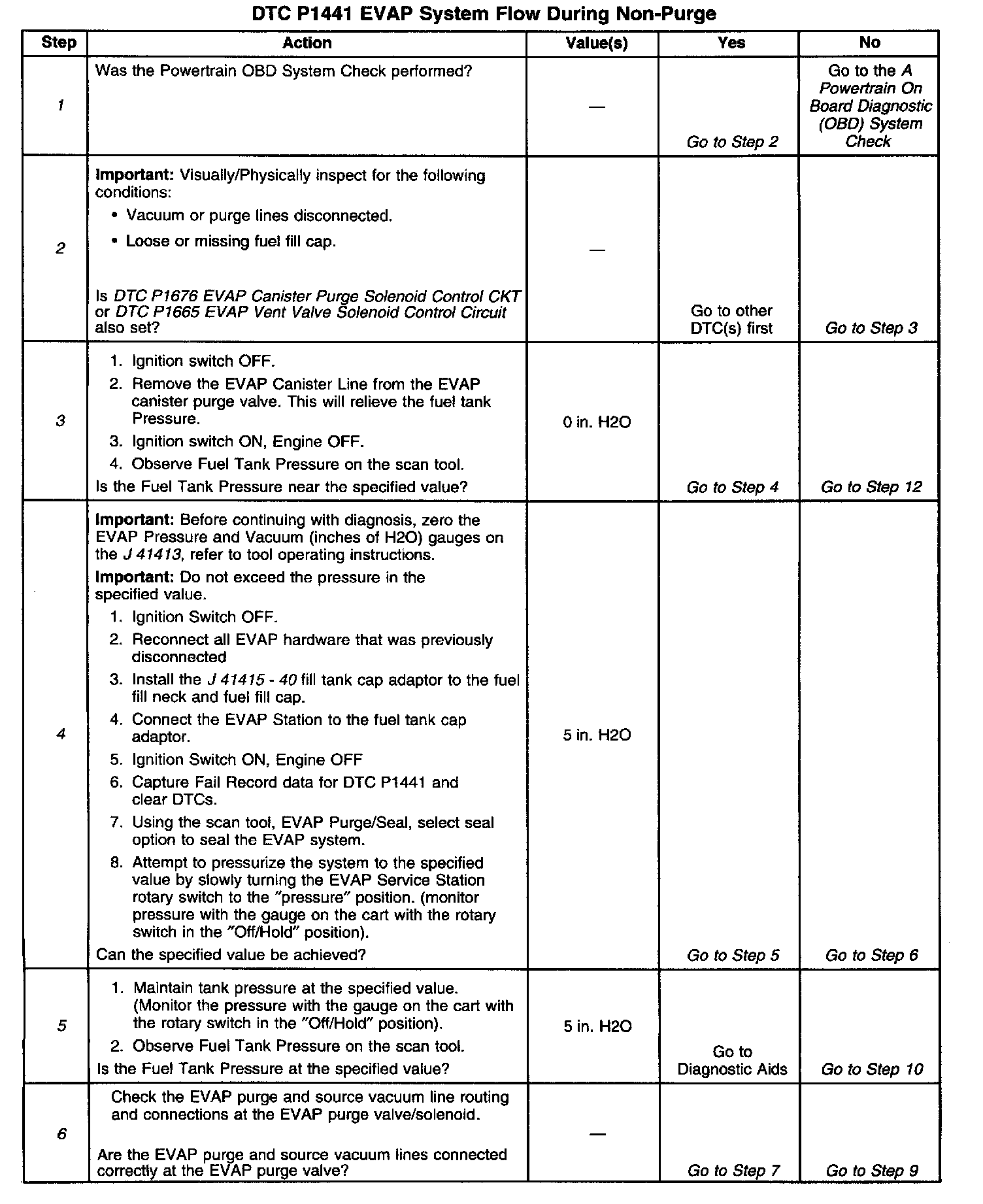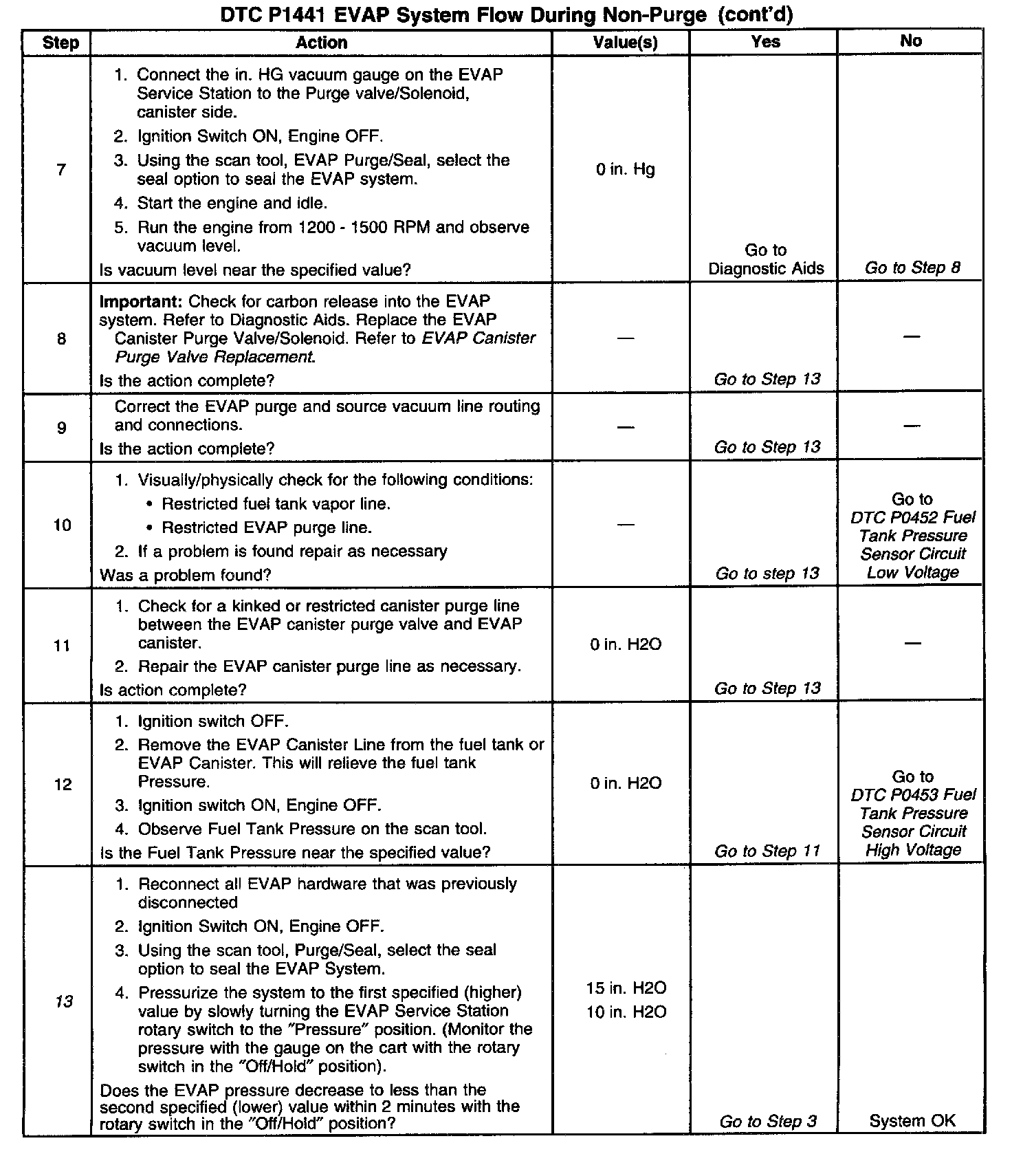 ^ If the harness appears to be OK, connect the J 41413 to the EVAP service port, pressurize the EVAP system to 10 in. H2O and observe the Fuel Tank Pressure display on the scan tool while moving connectors and wiring harnesses related to the EVAP purge valve. A sudden change in the display will indicate the location of the malfunction.