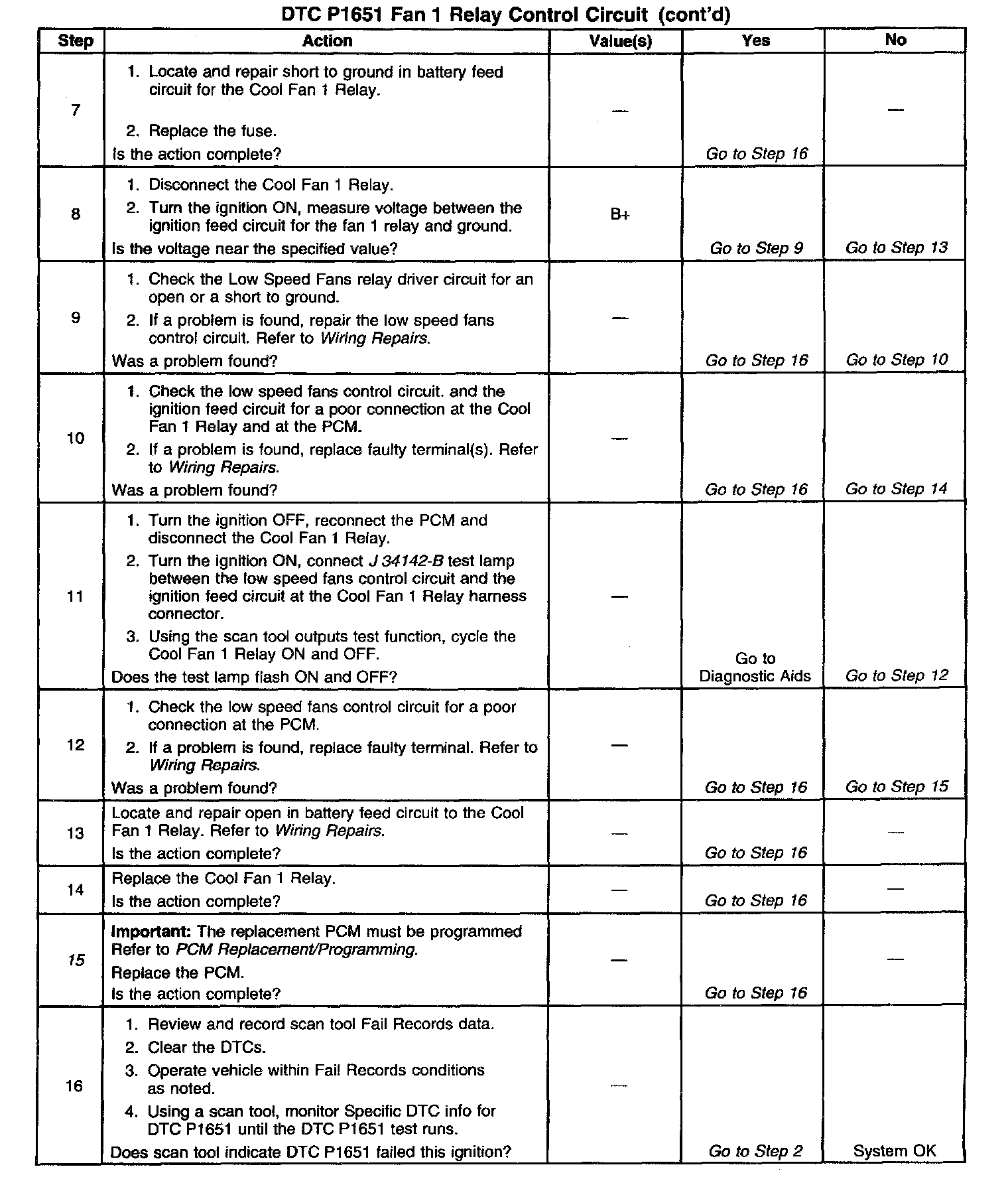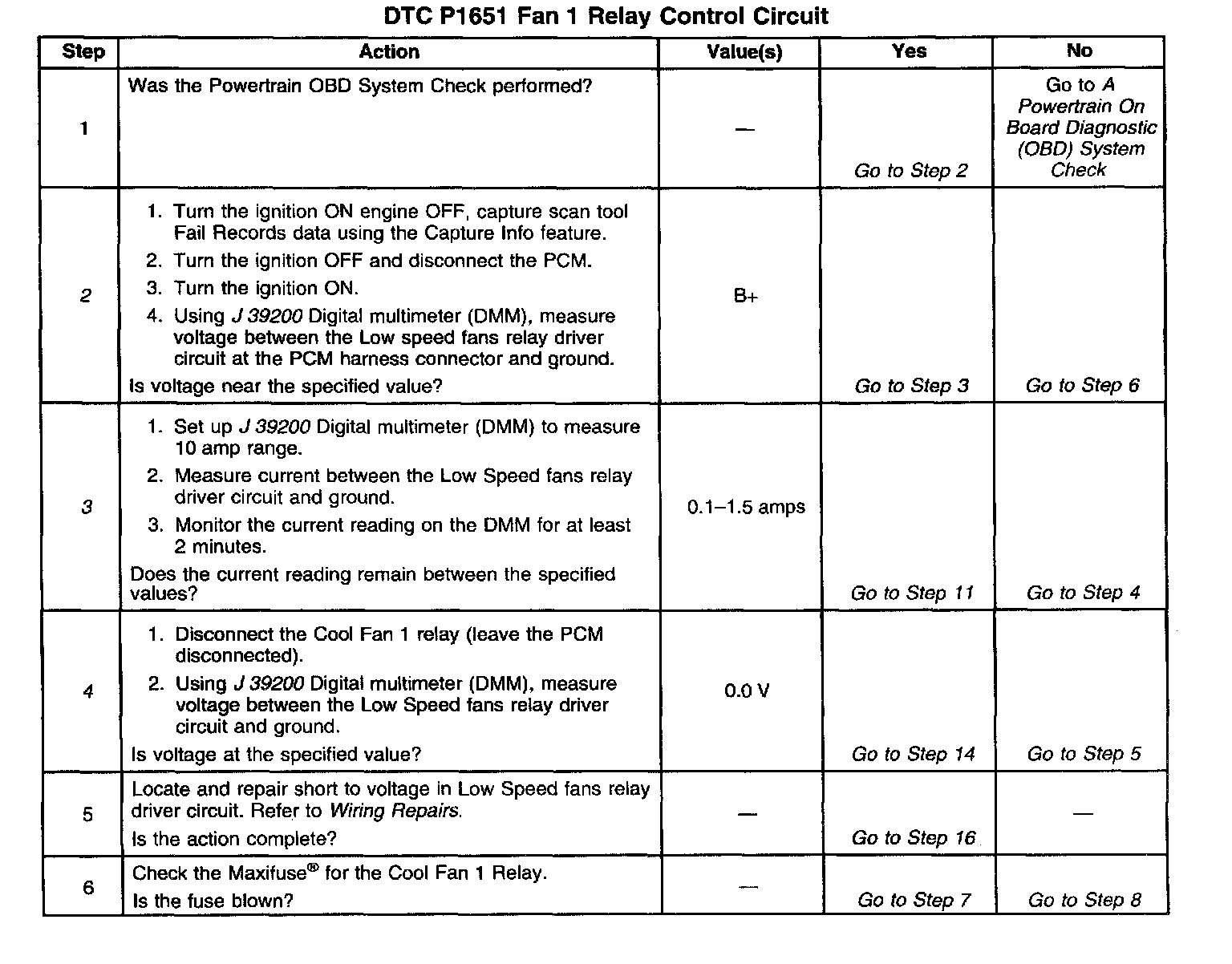 Output Driver Modules (ODMs) are used by the PCM to turn on many of the current-driven devices that are needed to control various engine and Transaxle functions. Each ODM is capable of controlling up to 7 separate outputs by applying ground to the device which the PCM is commanding on. DTC P1651 set indicates an improper voltage level has been detected on ODM B output 1, which controls the Cool Fan 1 relay.