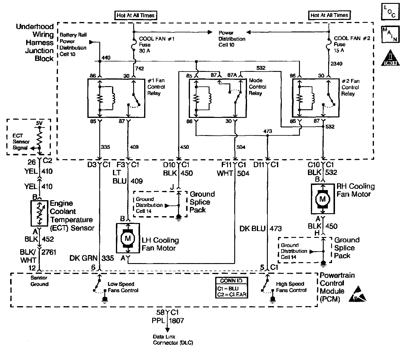 ^ Damaged harness - Inspect the wiring harness for damage. If the harness appears to be OK, disconnect the PCM, turn the ignition on and observe a voltmeter connected to the Low Speed fans driver circuit at the PCM harness connector while moving connectors and wiring harnesses related to the Cool Fan 1 relay. A change in voltage will indicate the location of the fault.