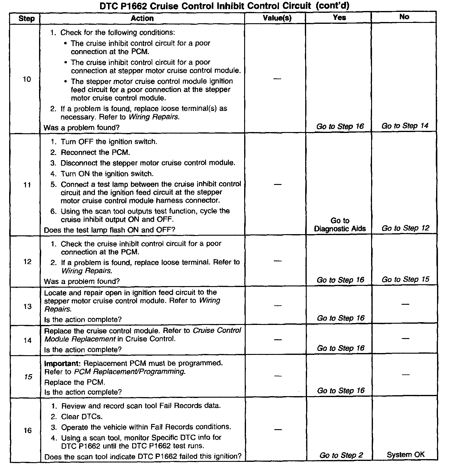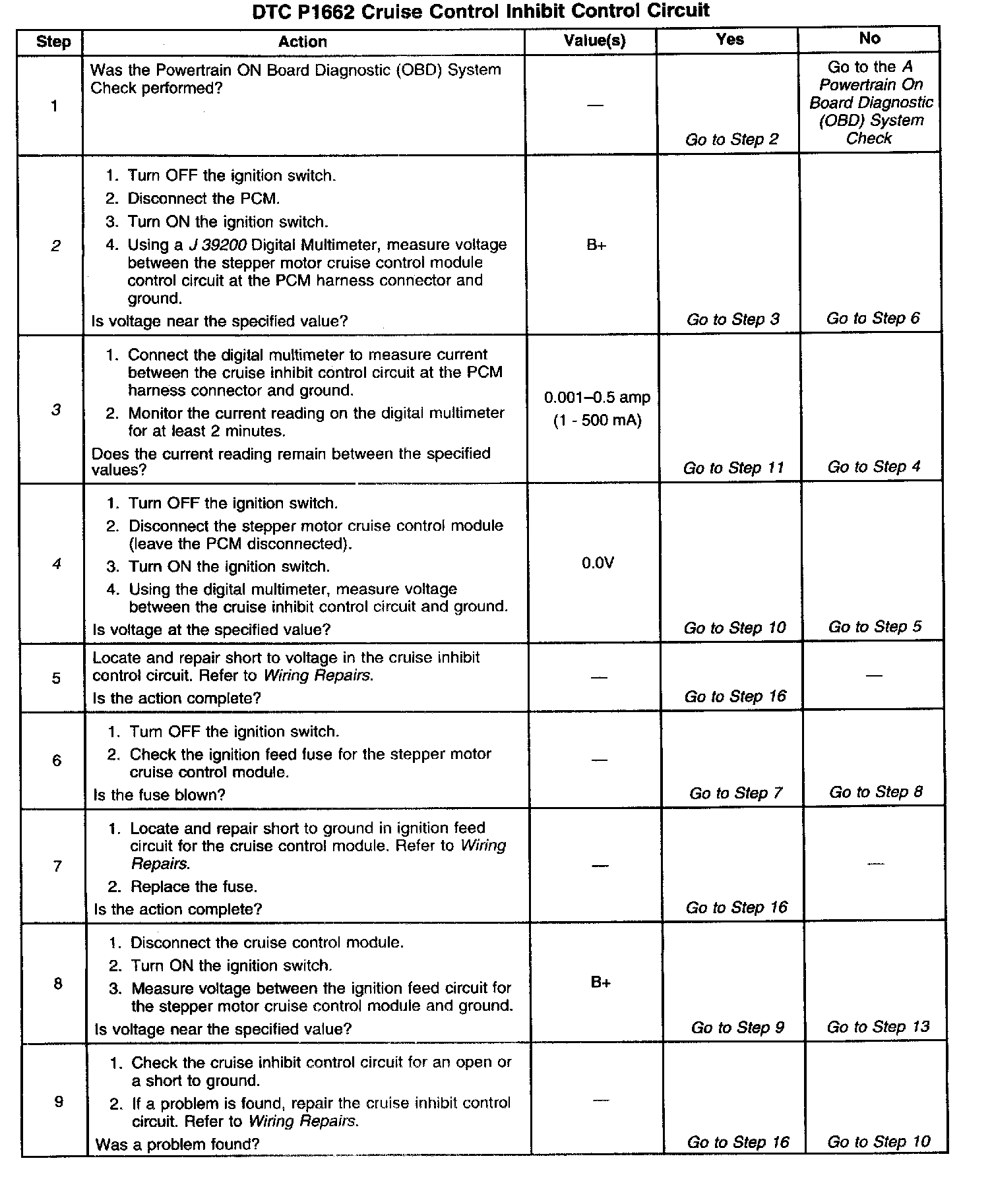 Output Driver Modules (ODMs) are used by the PCM to turn on many of the current-driven devices that are needed to control various engine and Transaxle functions. Each ODM is capable of controlling up to 7 separate outputs by applying ground to the device which the PCM is commanding ON. Unlike the Quad Driver Modules (QDMs) used in prior model years, ODMs have the capability of diagnosing each output circuit individually. DTC P1662 set indicates an improper voltage level has been detected on the output circuit which controls the stepper motor cruise control inhibit circuit.