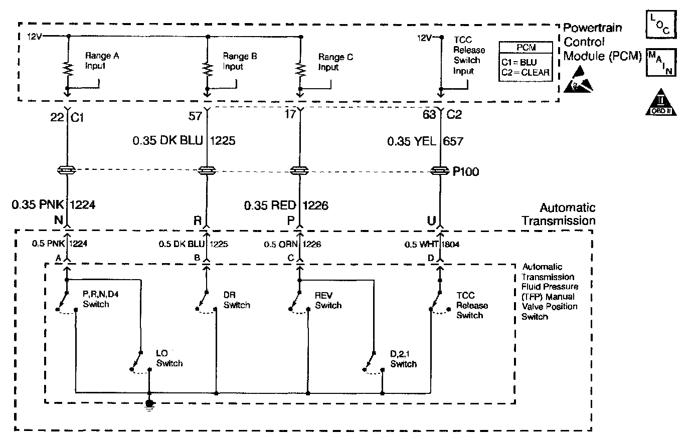 The automatic Transmission Fluid Pressure (TFP) manual valve position switch consists of six pressure switches. Five of the switches are normally-open, and determine gear range selection. The sixth switch is normally-closed, and detects Torque Converter Clutch (TCC) release fluid pressure.