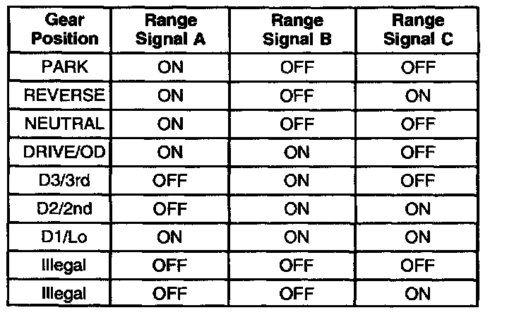 The PCM provides battery voltage on the three range signal circuits. By grounding one or more of the switches with fluid pressure from the manual shift valve, the PCM detects the selected gear range. When you disconnect the transmission electrical connector and the ignition switch is ON, the ground potential for three range signals from the PCM will be removed, and an illegal gear will be indicated.