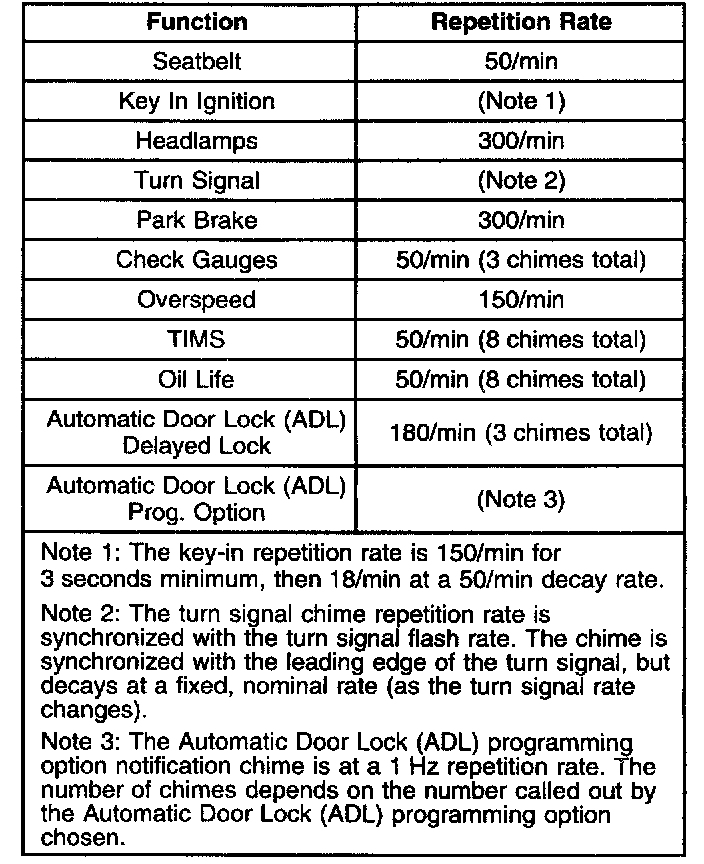 The Body Control Module (BCM) determines the priority of the chime requests and the highest priority chime request is activated. The functions which cause the audible warning to be activated by the BCM are listed from lowest to highest priority:1. Automatic Door Lock (ADL)-delayed locking verification