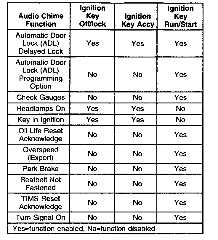 Upon a loss of Body Control Module (BCM) Class 2 serial data, the chimes turn OFF for all check-gauges chimes associated with the BCM indicator messages. Regardless of Class 2 serial data condition, the following chimes become active when the necessary conditions are present: