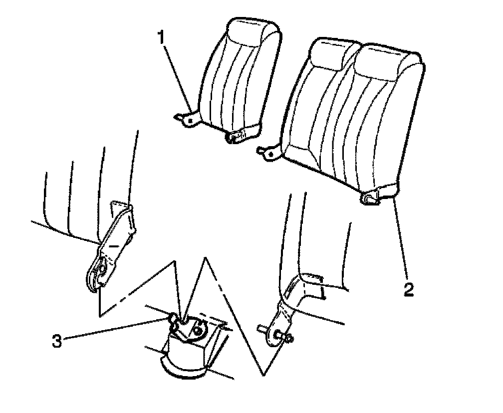 2. Lift up the right rear seat back (1). Disconnect the seat back (1) from the pivot bracket (3).