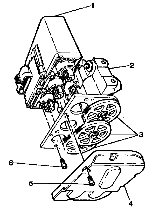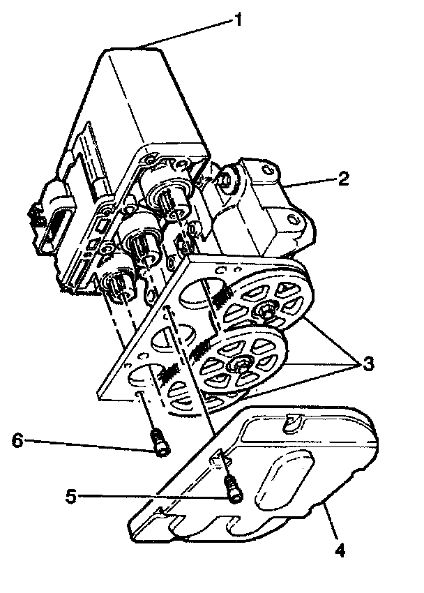 4. Remove the four Torx head screws (6) attaching the motor pack (1) to the brake modulator (2).