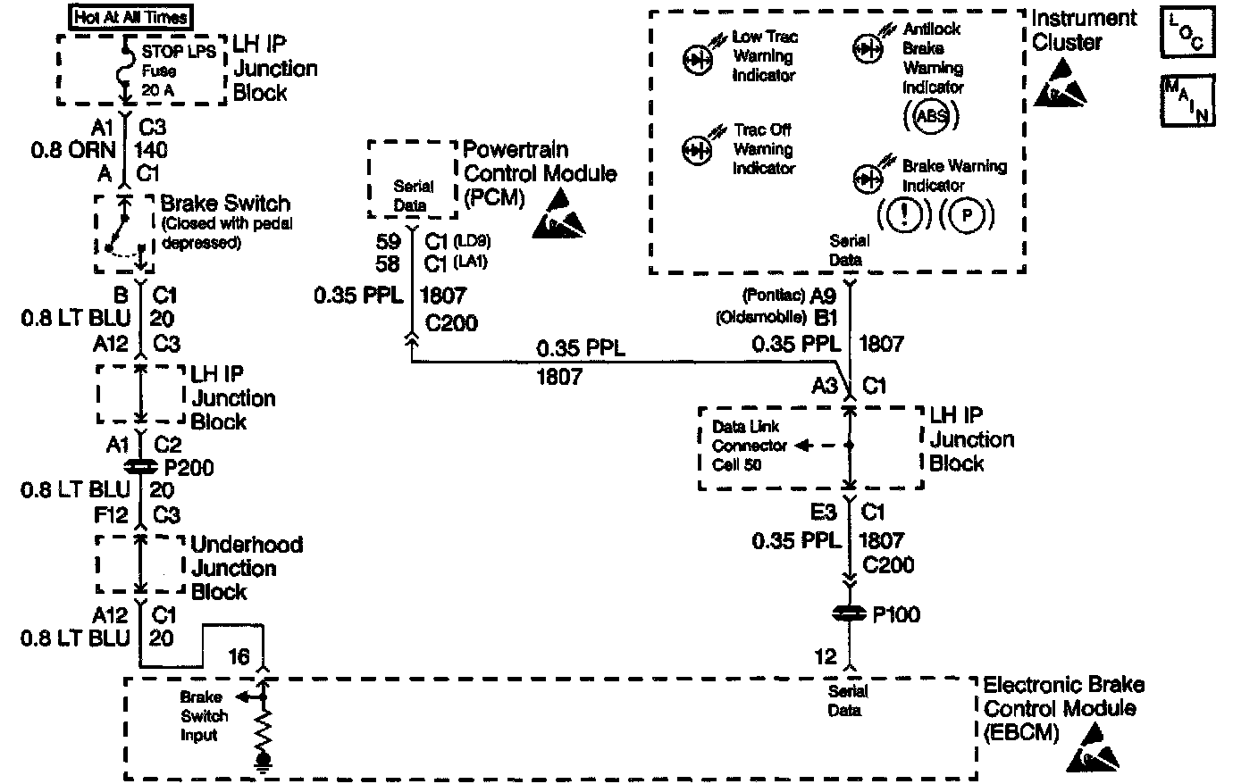 Two-way serial communication is sent back and forth between the EBCM and the IPC. A message from the IPC is sent to the EBCM within seven seconds after ABS initialization. A serial communication failure does not allow the proper warning indicator commands to be sent back to the IPC.