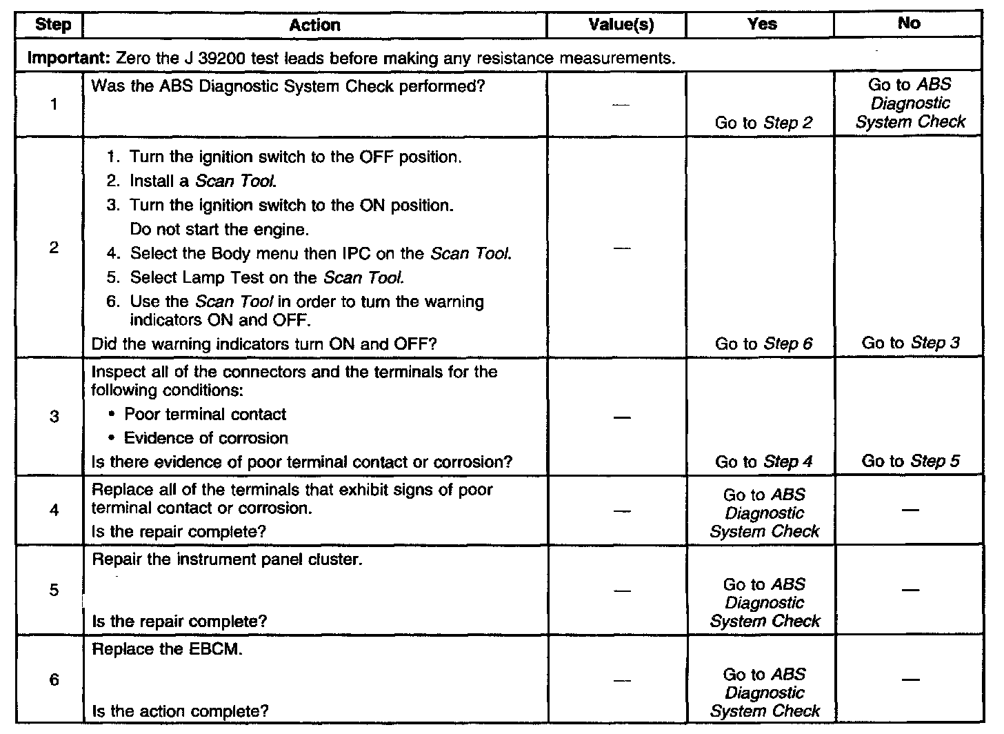Two-way serial communication is sent back and forth between the EBCM and the IPC. A message from the IPC is sent to the EBCM within seven seconds after ABS initialization. A serial communication failure does not allow the proper warning indicator commands to be sent back to the IPC.