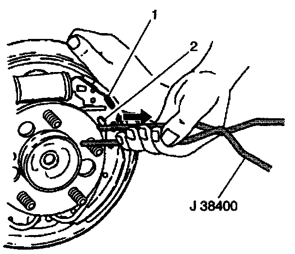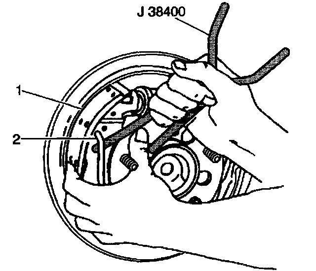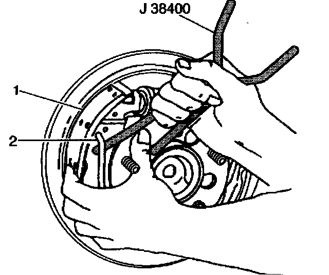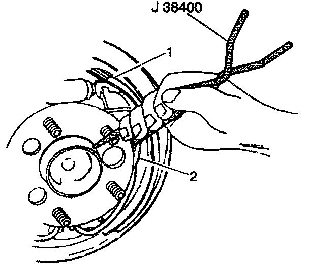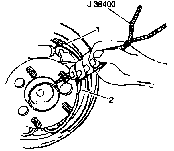 3. Use the J 38400 in order to pull up the end of the return spring (2), resting the return spring on the web of the brake shoe (1).