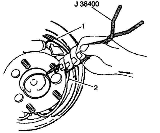 13. Lift the end of the return spring (2) from the parking brake shoe and the parking brake lining (1). Insert the hook end of the J 38400 between the return spring and the parking brake shoe web. Pry or twist the J 38400 in order to lift the end of the spring out of the shoe web hole.