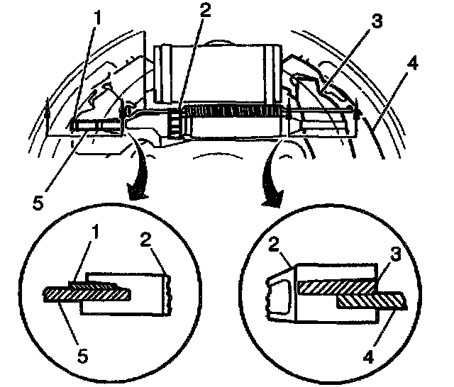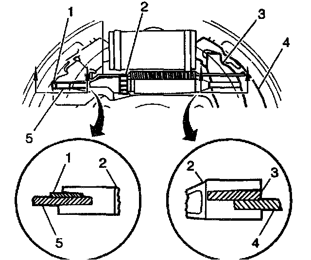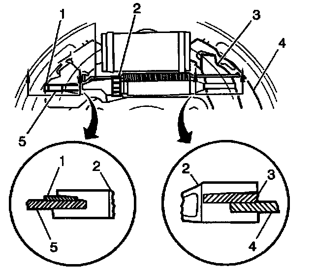 7. Remove the lift end of the return spring (2) from the adjuster shoe and the lining (1).