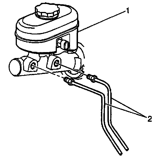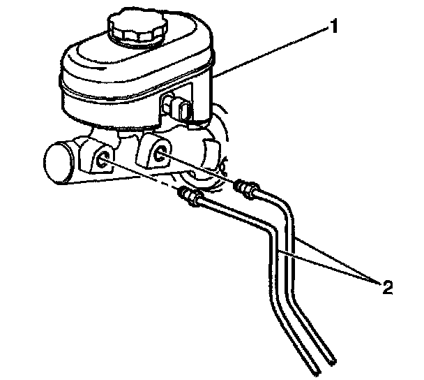 6. Disconnect the brake pipes (2) from the master cylinder (1).