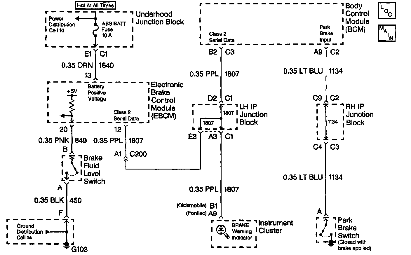 ^ A switch built into the brake master cylinder reservoir will signal the Electronic Brake Control Module (EBCM) if the brake fluid level drops below a safe level. The EBCM will command the indicator on via serial data with the instrument cluster. In addition, the indicator is commanded on when the EBCM is initially powered up (the ignition switch is turned to the ON position).