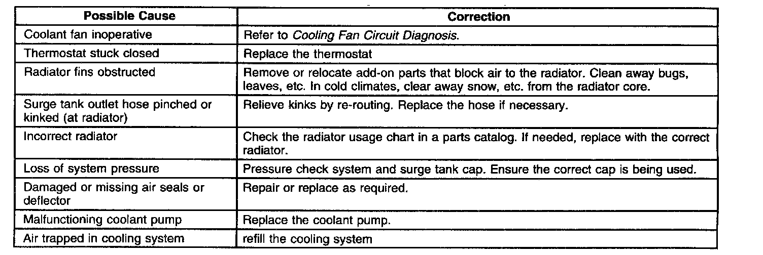 If these conditions can be eliminated as the cause of overheating, refer to the table below.