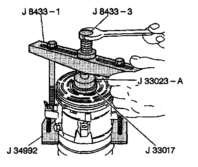 16. Tighten the J 8433 - 3 in the J 8433 - 1 in order to force the pulley rotor and bearing assembly onto the front head of the compressor.