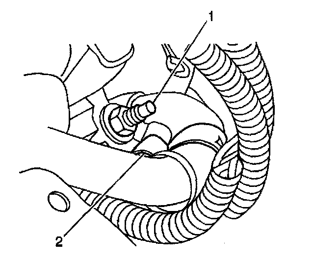 2. Remove the power steering hose nut (1) and retainer (2).