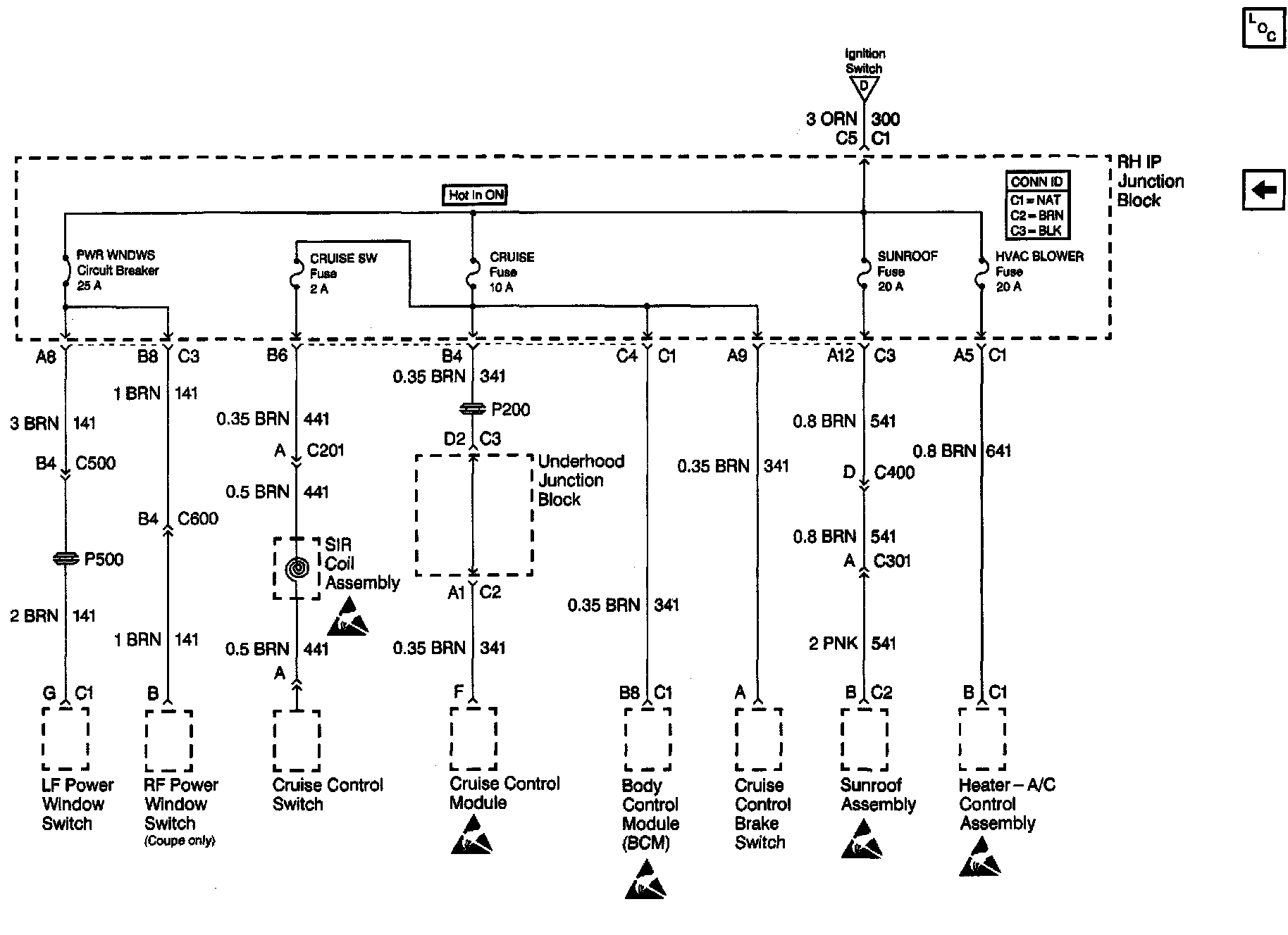 Power Distribution Schematics: PWR WNDWS, CRUISE, SUNDROOF, HVAC BLOWER: