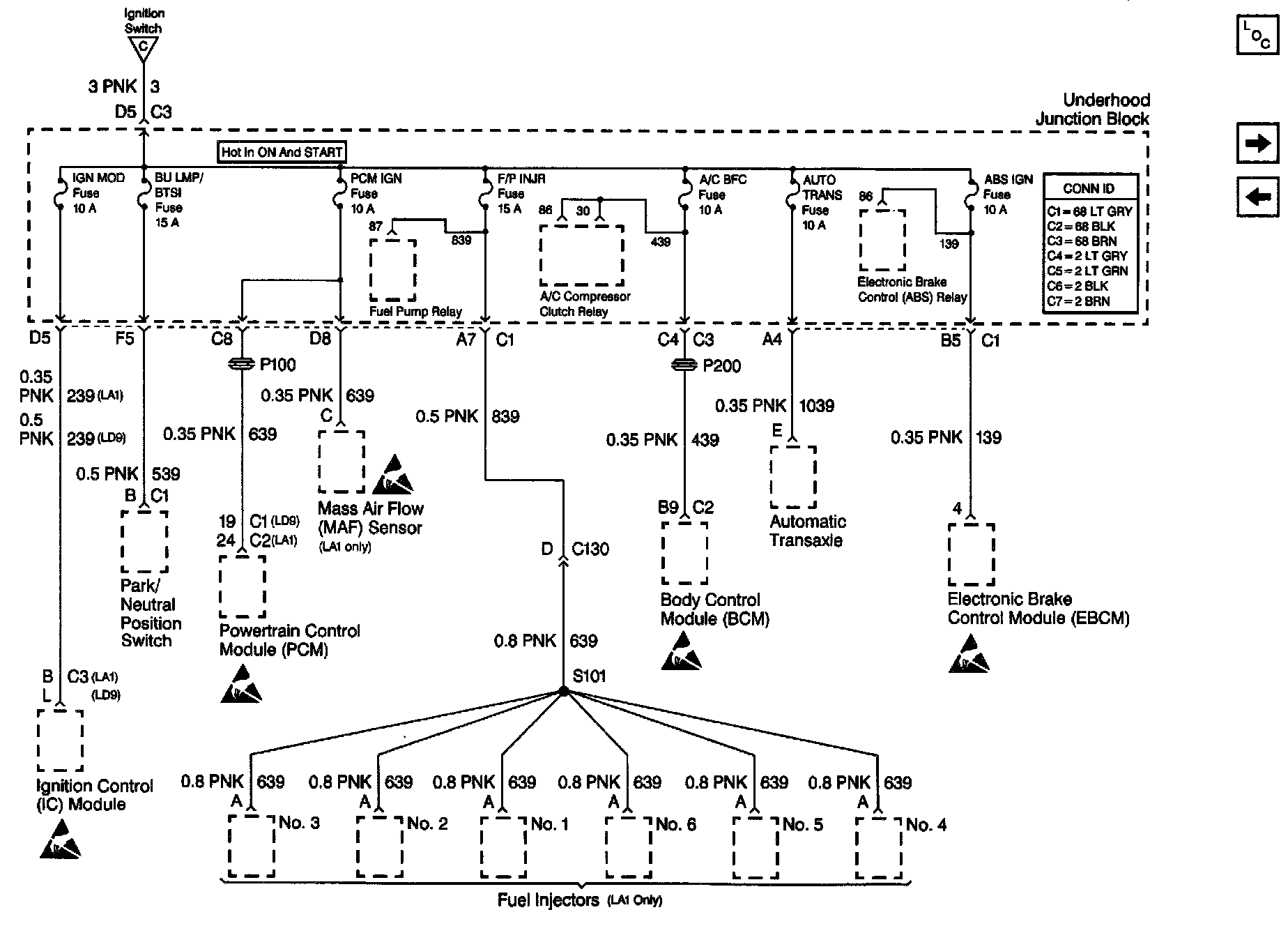 Power Distribution Schematics: IGN MOD, BU LMP/BTSI, PCM IGN, F/P INJR, A/C BFC, AUTO TRANS, ABS IGN Fuses: