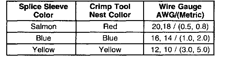 Use crimp and seal splice sleeves to form a one-to-one splice on all types of insulation except tefzel and coaxial to form a one-to-one splice. Use tefzel and coaxial where there is special requirements such as moisture sealing. Follow the instructions below in order to splice copper wire using crimp and seal splice sleeves.Crimp And Seal Splice Table: