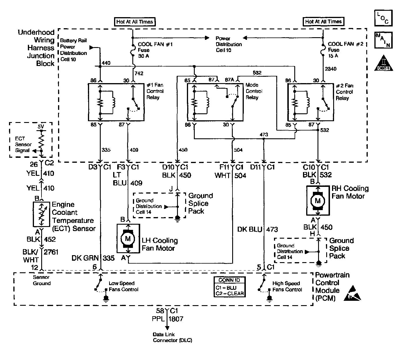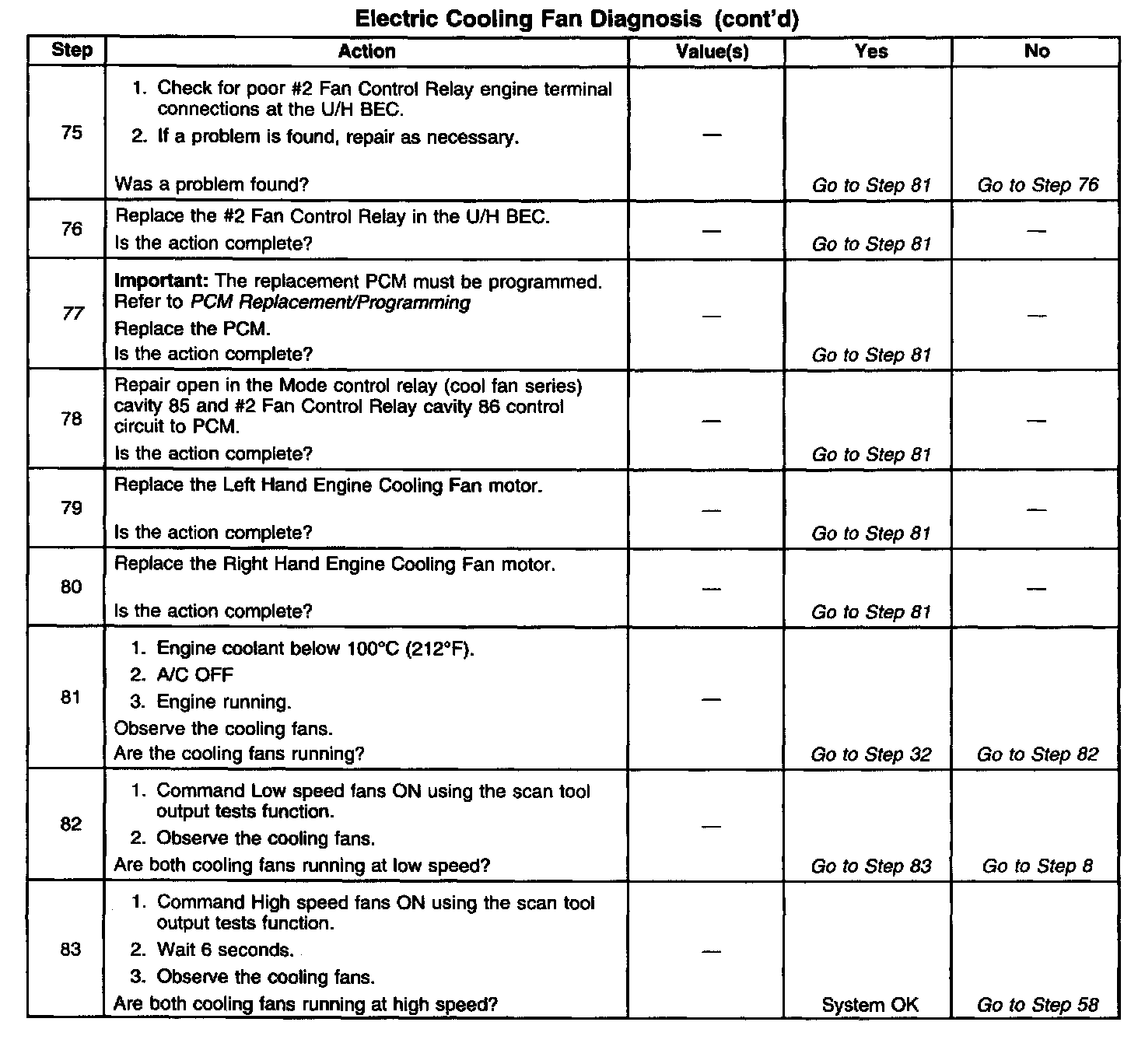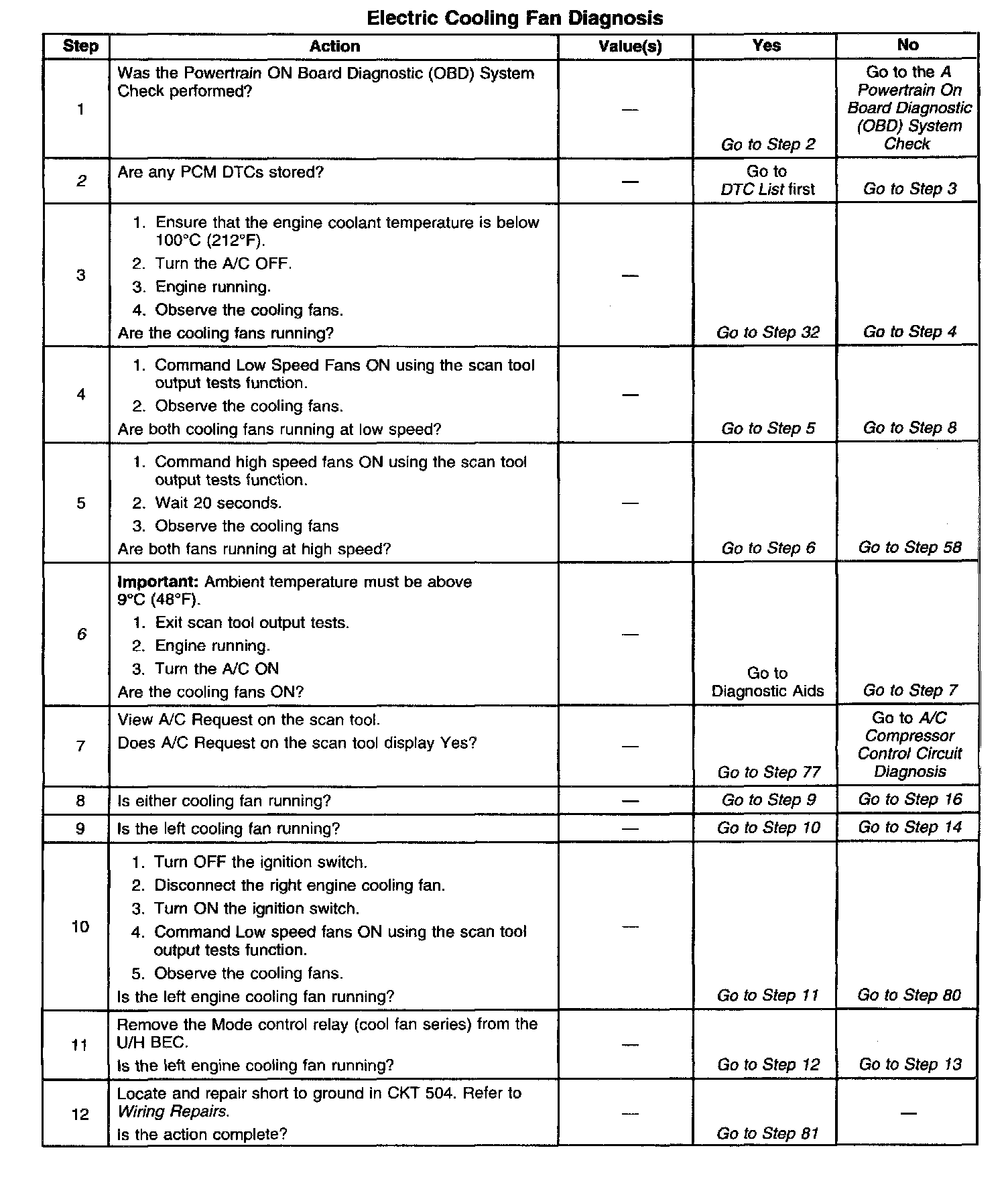 2. Stored diagnostic trouble codes may affect engine cooling fans operation. This diagnostic table may lead to improper diagnosis and replacement of good parts if diagnostic trouble codes are present.