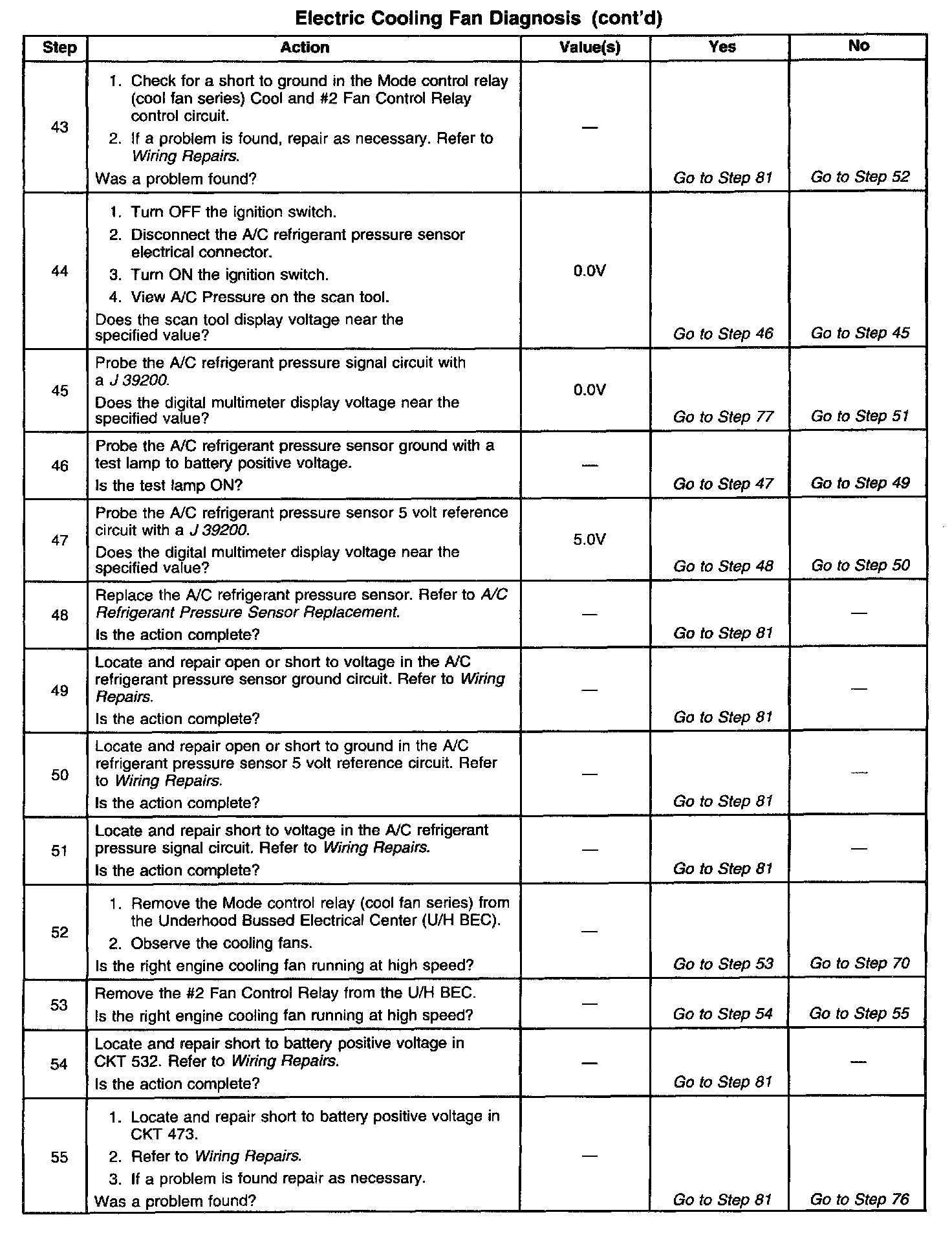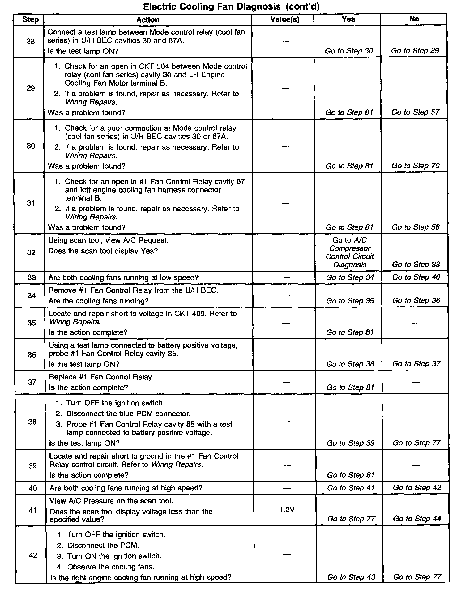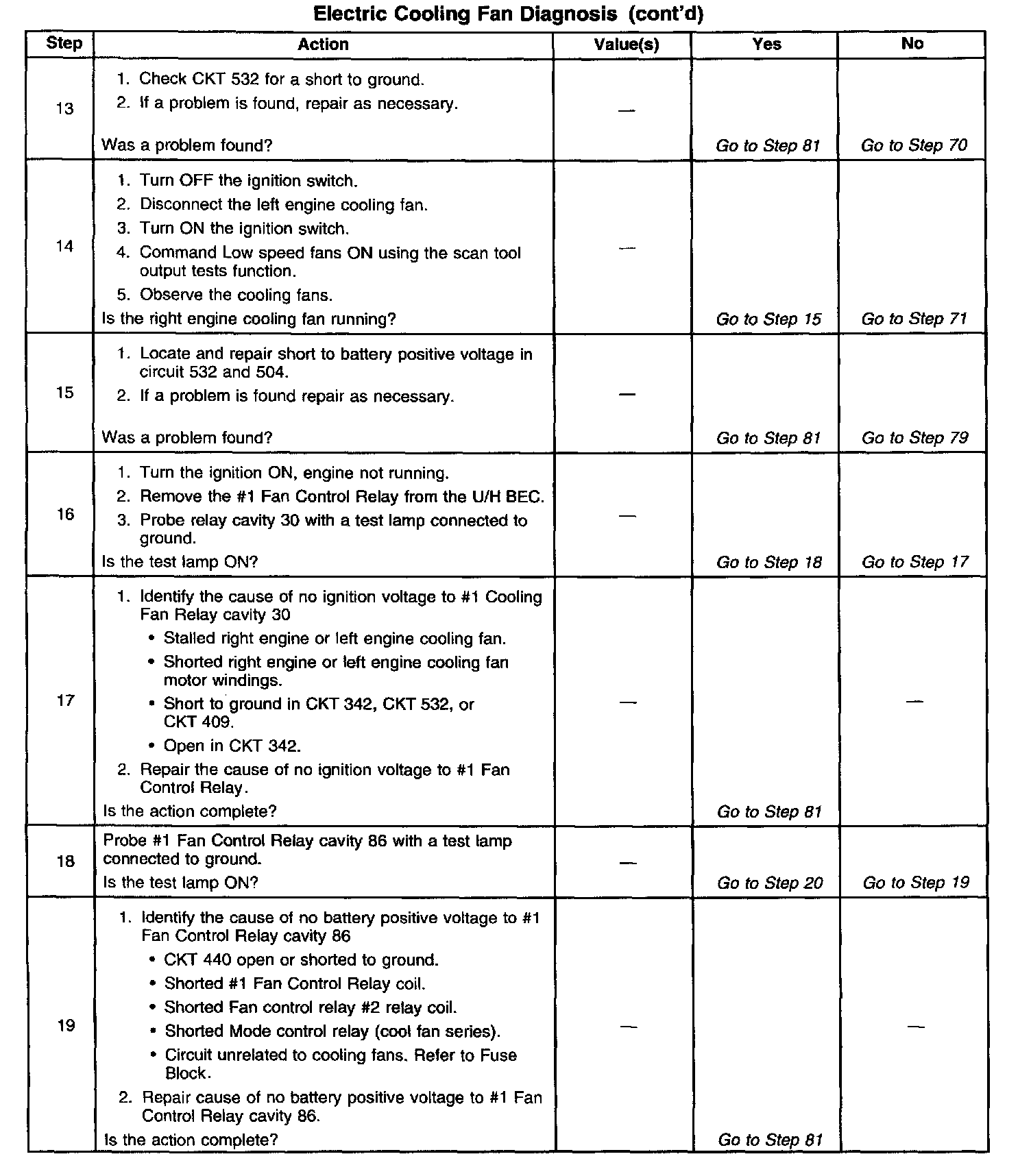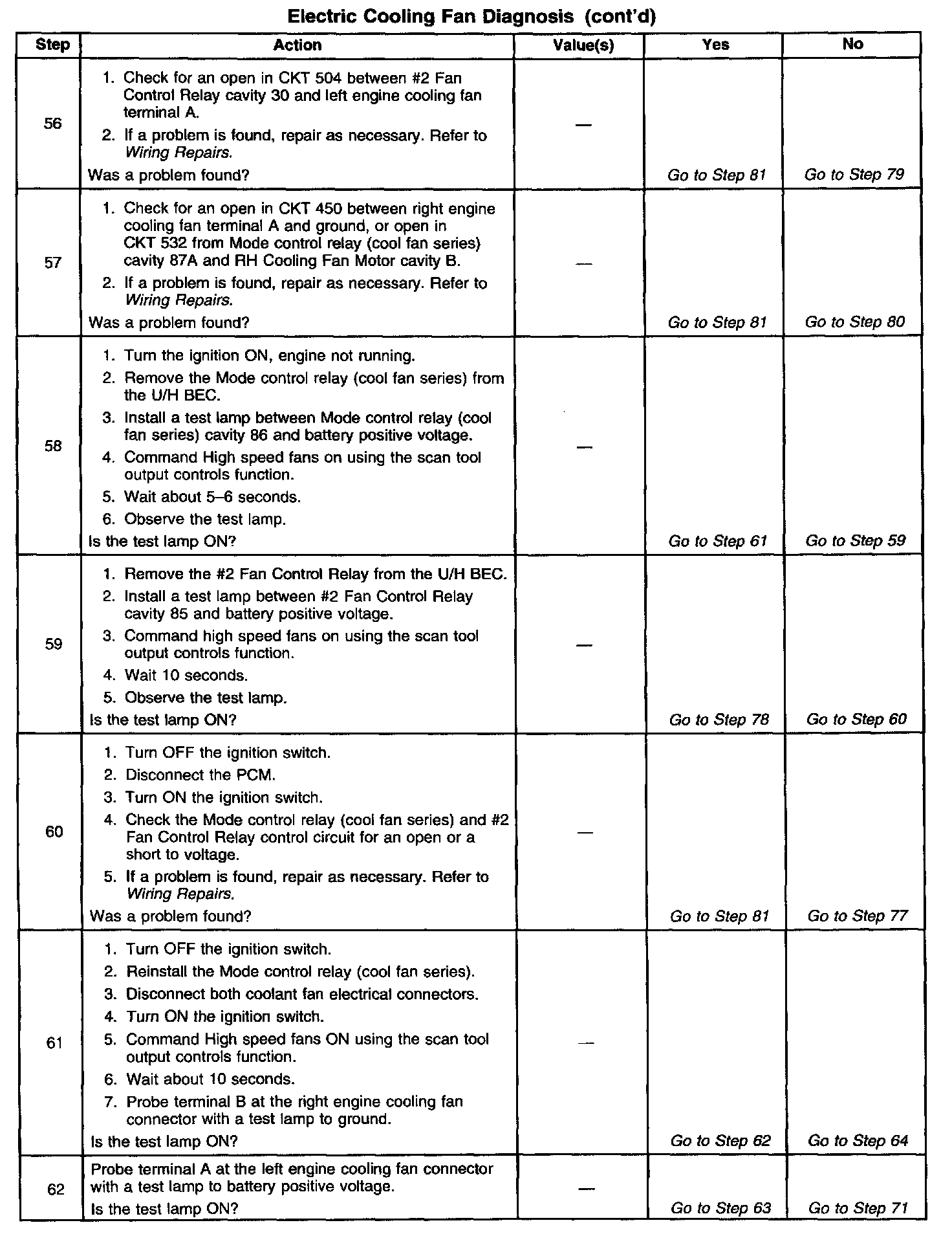 2. Stored diagnostic trouble codes may affect engine cooling fans operation. This diagnostic table may lead to improper diagnosis and replacement of good parts if diagnostic trouble codes are present.