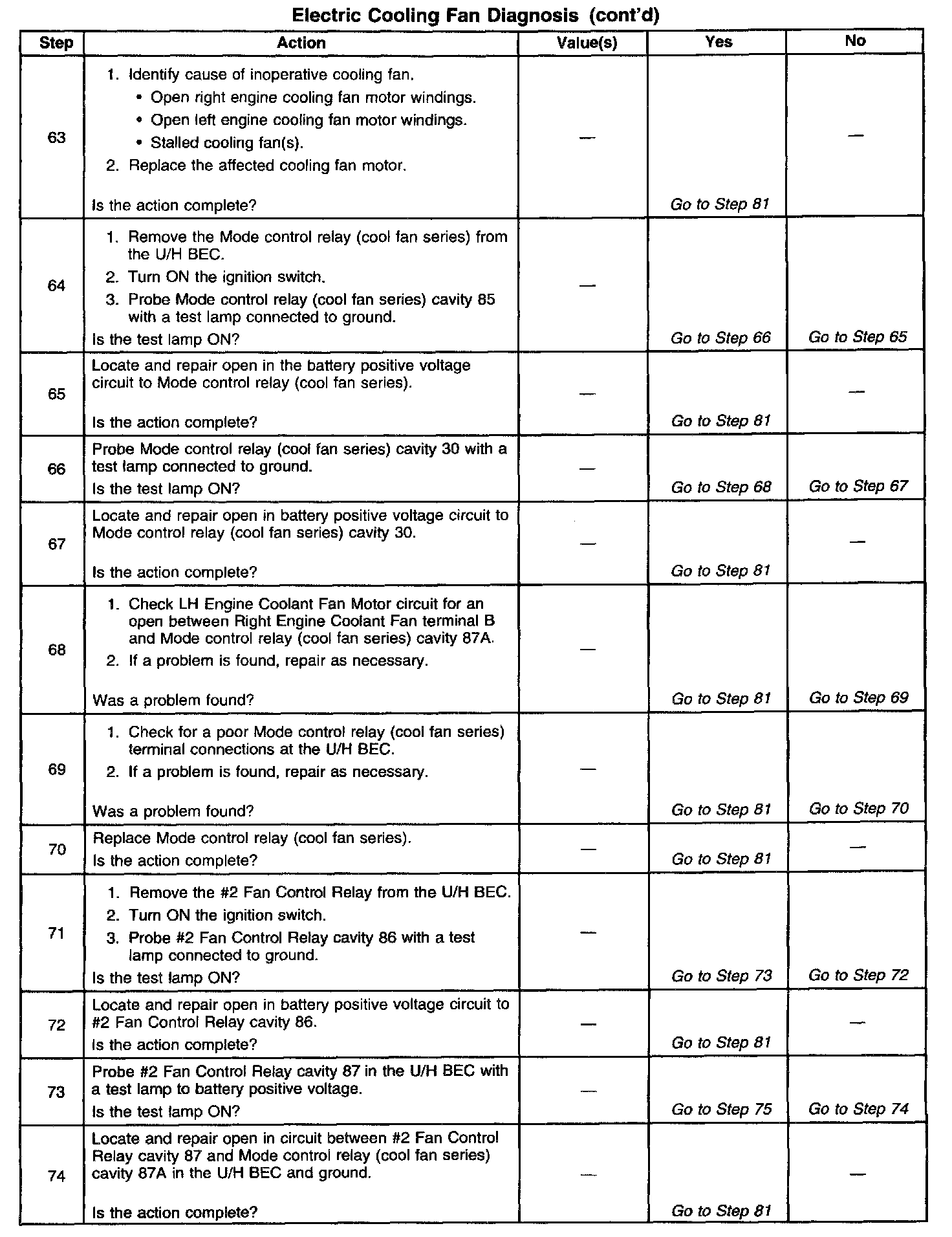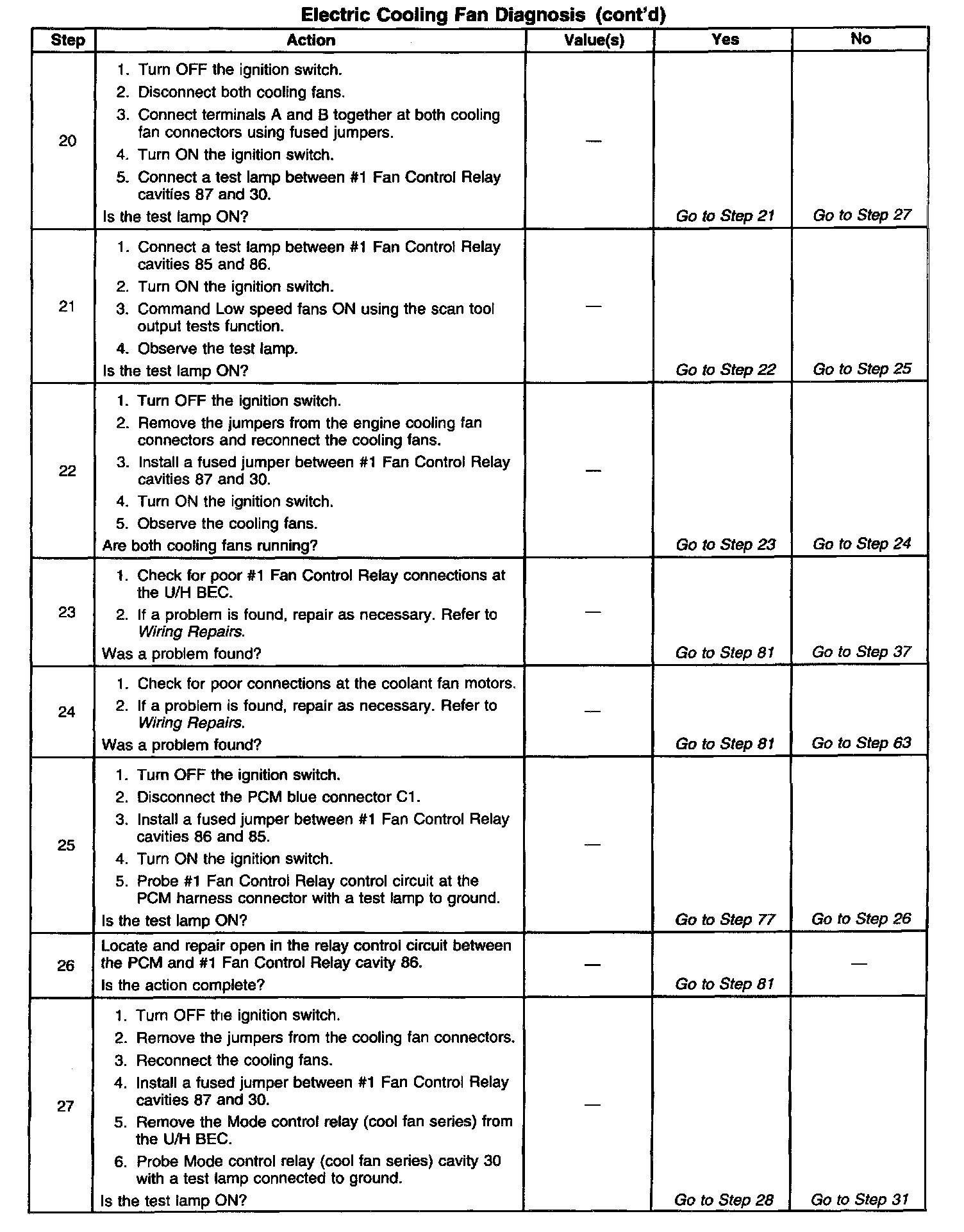 ^ Poor connection at the PCM, cooling tan relays, or cooling fan motors. Inspect harness connectors for backed out terminals, improper mating, broken locks, improperly formed or damaged terminals, and poor terminal to wire connection.