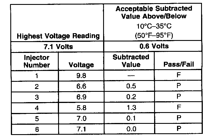 3. The first second of the voltage displayed by the DVM may be inaccurate due to the initial current surge, therefore, record the lowest voltage displayed by the DVM after the first second of the test. The voltage displayed by the DVM may increase throughout the test as the fuel injector windings warm and the resistance of the fuel injector windings changes. An erratic voltage reading (large fluctuations in voltage that do not stabilize) indicates an intermittent connection within the fuel injector. From the voltages recorded, identify the highest voltage, excluding any voltages above 9.5 volts. Subtract each voltage that is not above 9.5 volts from the highest voltage. Record each subtracted value. The subtracted value for any fuel injector must not exceed 0.6 volt. A fuel injector with a subtracted value that is greater than 0.7 volt is considered faulty and must be replaced. A fuel injector with a recorded voltage above 9.5 volts is also considered faulty and must be replaced.