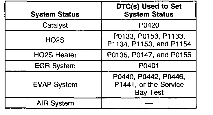 IMPORTANT: The System Status display indicates only if the PCM has completed the required tests (DTCs). The System Status display does not necessarily mean that the test has passed. If a failure indication is present for a DTC associated with one of the above systems, that test has failed. Diagnosis and repair are necessary in order to meet the I/M requirement. Verify that the vehicle passes all of the diagnostic tests associated with the displayed System Status prior to returning the vehicle to the customer.