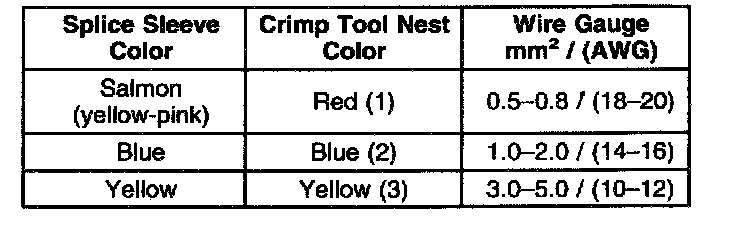 Refer to the table for color coding of the splice sleeves, and the crimp tool nests.