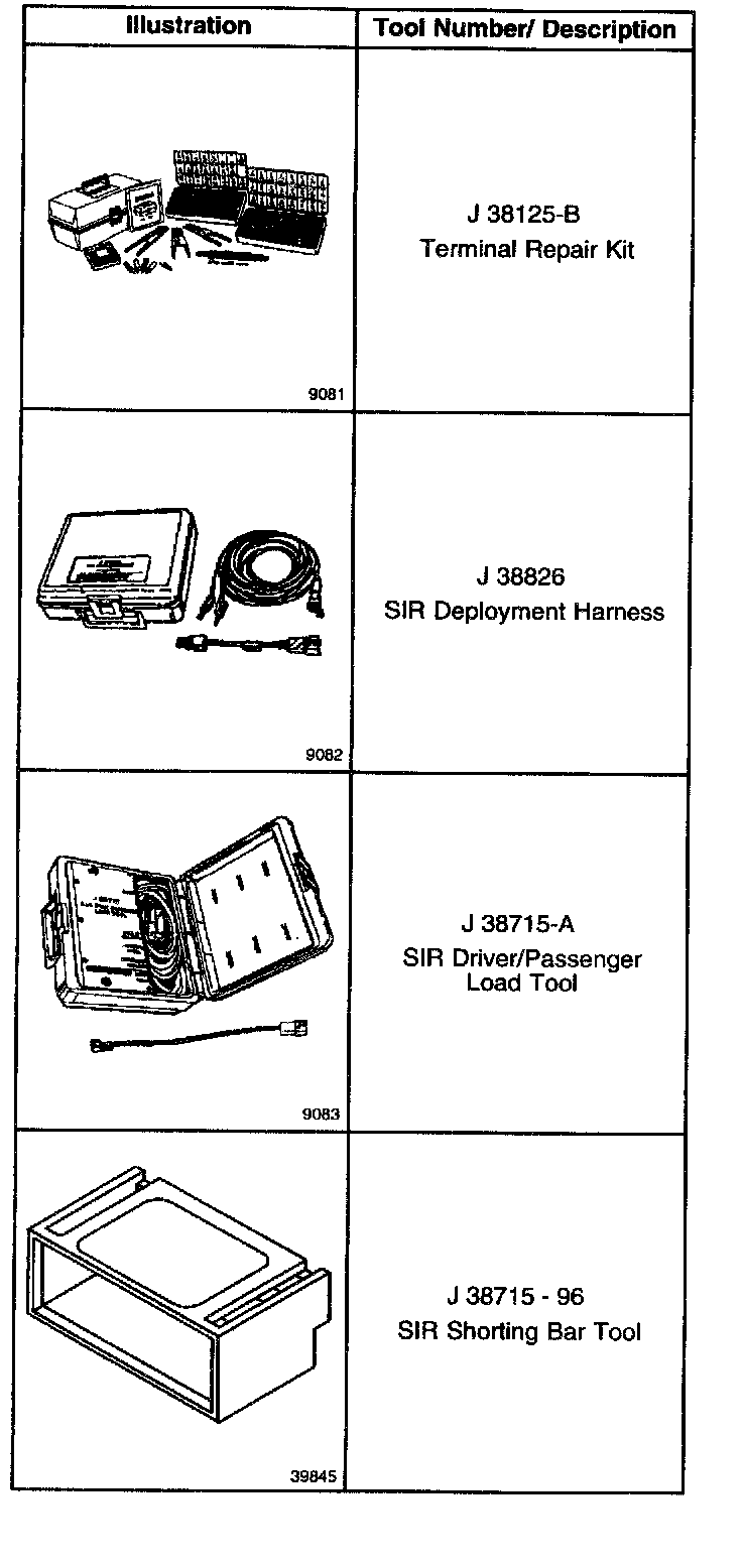 Use J 38125-A Terminal Repair Kit for SIR wiring repair. This kit contains a special crimping tool, heat torch, and sealed splices. Do not use the terminals in the kit to replace damaged SIR system terminals unless specifically indicated by the terminal package.