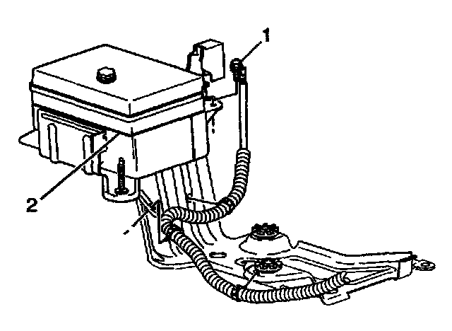 4. Remove the cover from the underhood junction block (2) and the battery cable (1).