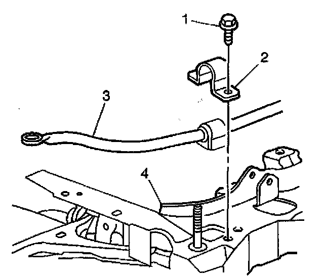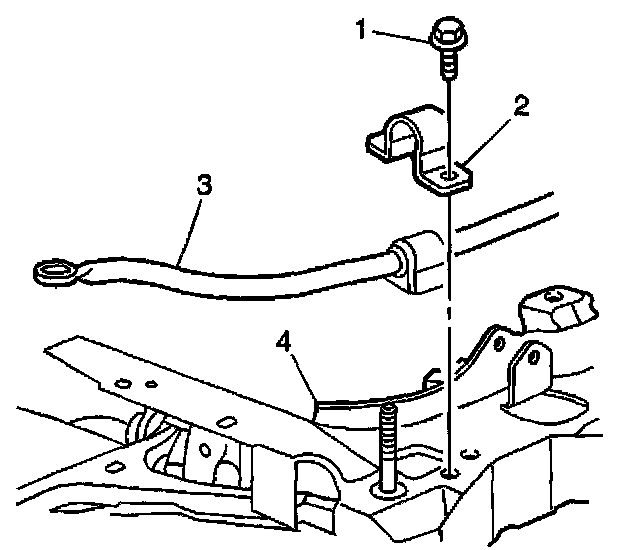7. Remove the bolts (1) from the clamps (2) attaching the stabilizer shaft (3) to the crossmember (4).