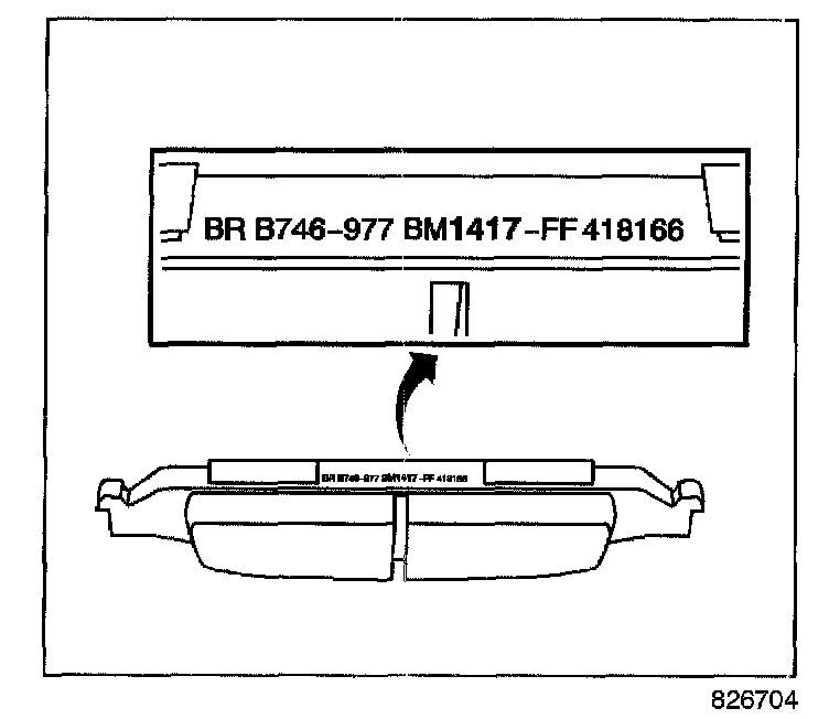 Confirm that the brake pads have the number 1417 printed on the edge of the pad backing plate (refer to the illustration - glass cleaner can be used to clean the area so that the print is visible). This indicates the correct brake pads have been previously installed. The brake pads contained in Front Pad Kit, P/N 18044437 are the only brake pads that should be used on these vehicles. If the number 1417 is not present, or if the number is not legible, replace the brake pads. If the correct pads were previously installed, verify the brake pad thickness. If the brake pad friction material thickness is 4.6 mm (0.18 in) or greater, re-use the pads. If the friction material thickness is less than 4.6 mm (0.18 in), install new brake pads contained in Front Pad kit, P/N 18044437.