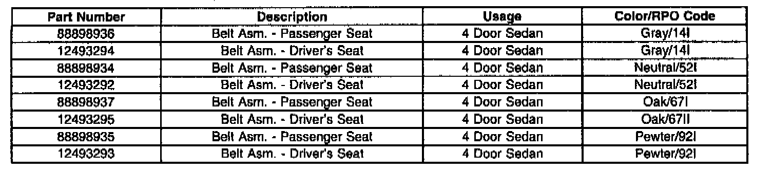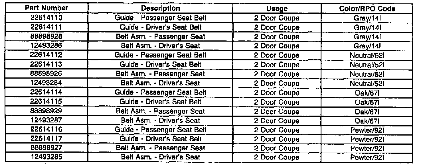 Part numbers for the Alero and Grand Am front seat belts and seat belt guides are the same. The part numbers listed as shown are grouped together by color and body style to make identification and ordering easier.