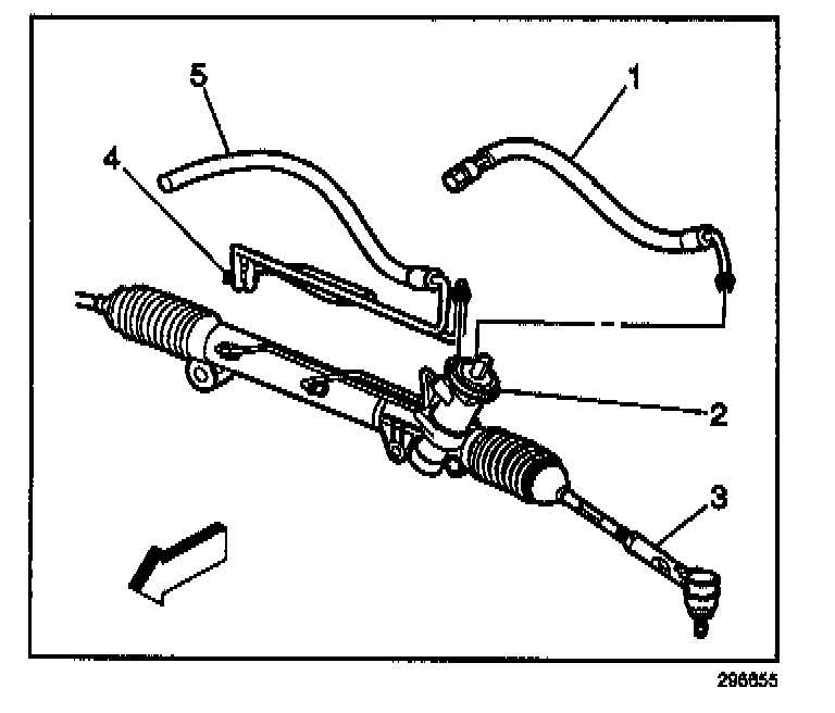 11. Install the new power steering return hose line assembly (5), P/N 26068108, to the vehicle.