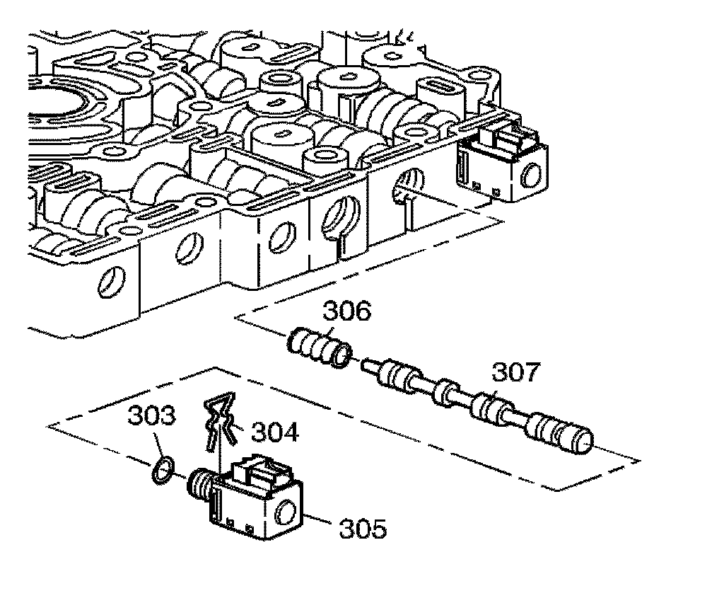1. Install the 2-3 shift valve spring (306), the 2-3 shift valve (307), the 2-3 shift solenoid (305) with O-ring (303) and the 2-3 shift solenoid retainer clip (304).