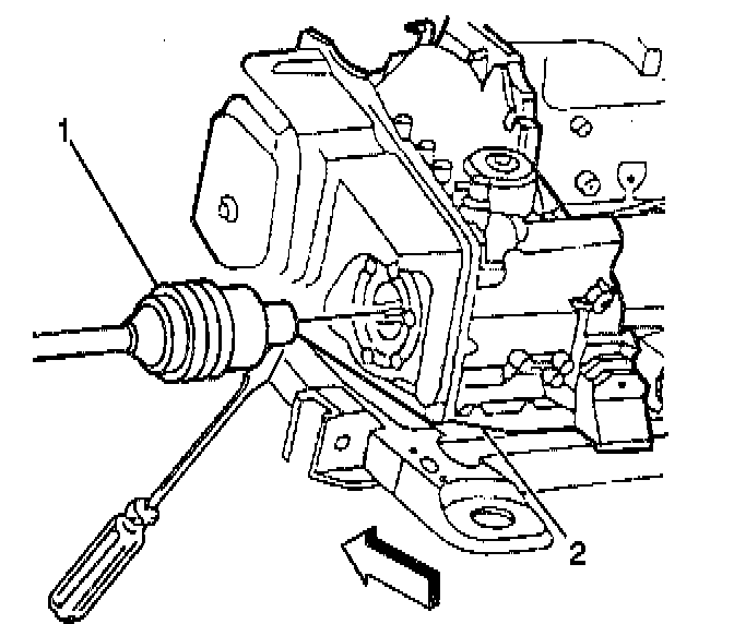 ^ Use the flat-bladed screwdriver in order to separate the left side axle shaft (1) from the transaxle (2).