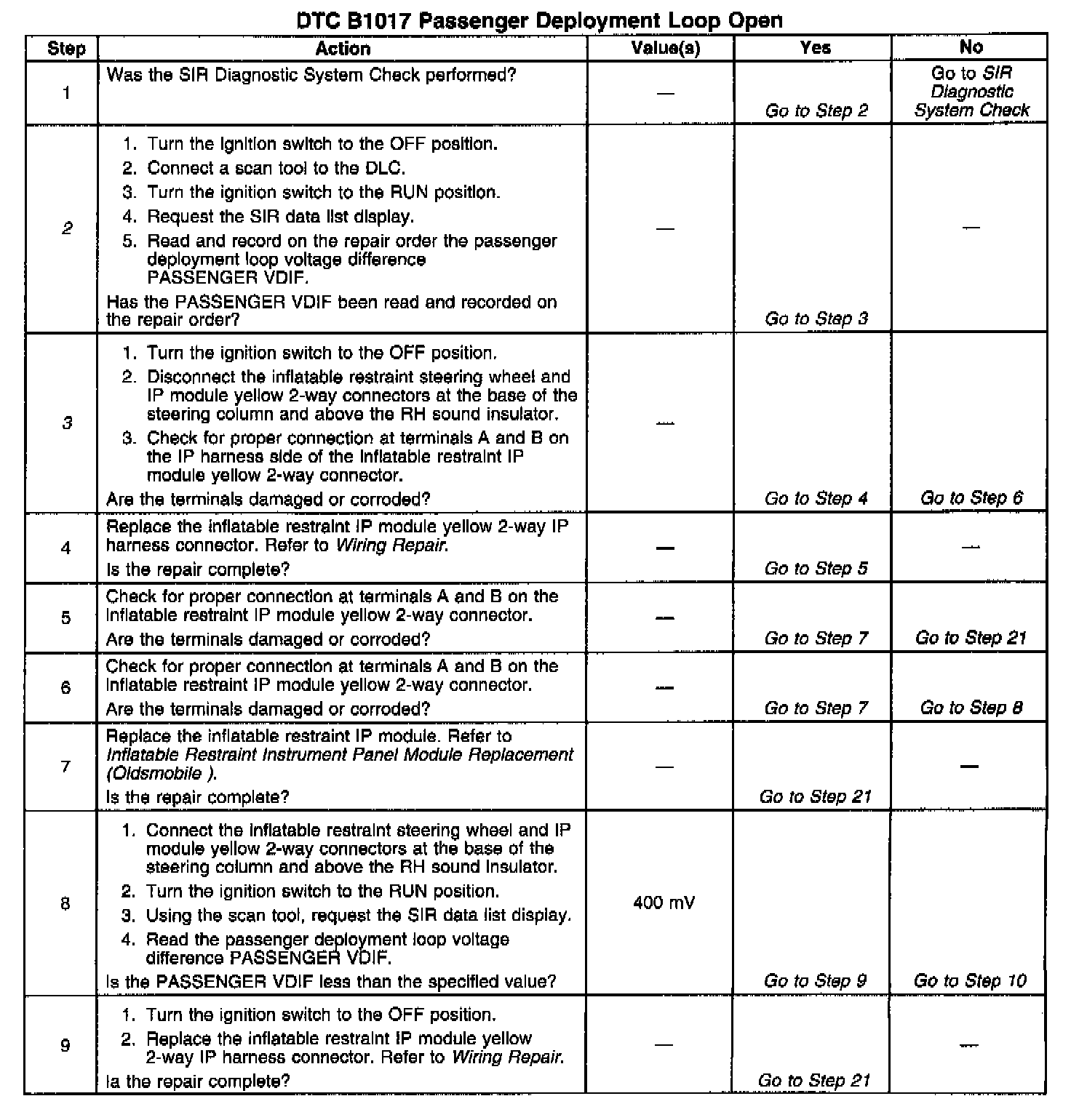 10. This test isolates the malfunction to one side of the Inflatable Restraint Instrument Panel (IP) module yellow 2-way connector.