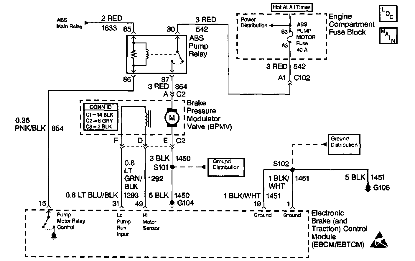 When the EBCM/EBTCM grounds terminal 15, the pump relay contacts close. The closed contacts apply voltage to the BPMV assembly's pump motor. The EBCM/EBTCM turns ON the pump motor during most ABS braking conditions and, when equipped, during all traction control conditions.