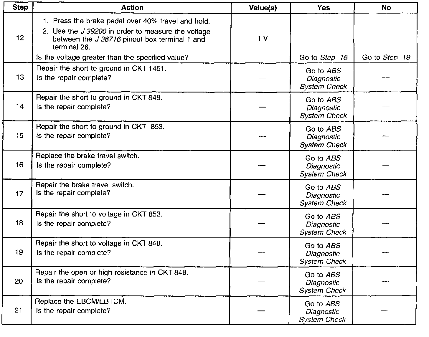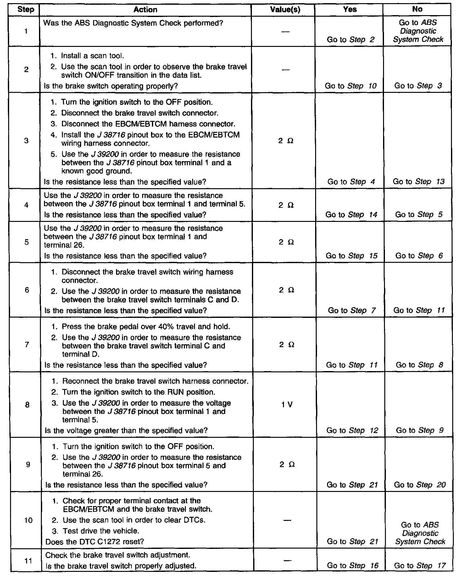 The DTC C1272 sets when the EBCM/EBTCM detects that the brake travel switch CKT 848 is shorted to ground or open (with the brake pedal pressed).