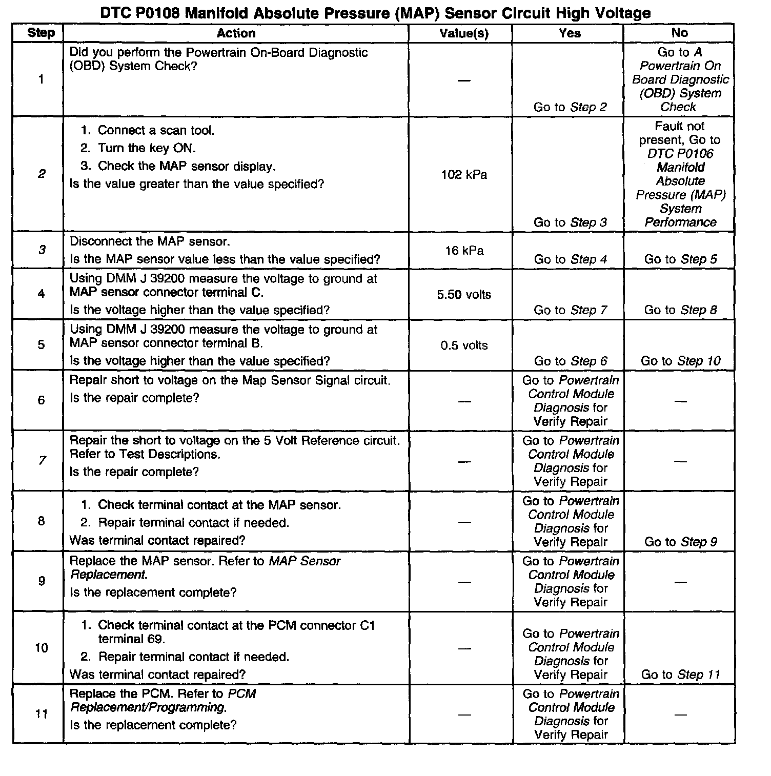 The Manifold Absolute Pressure sensor is a sensor that changes resistance based upon manifold vacuum. The PCM provides a 5 volt reference and ground. The MAP sensor signal varies between ground and 5 volts as manifold vacuum varies. As MAP decreases, voltage decreases, low engine load, high vacuum. As MAP increases, voltage increases, high engine load, low vacuum. The PCM uses the MAP sensor values as an indicator of engine load. If the MAP sensor signal goes high such as when the signal line is shorted to voltage or the MAP sensor is shorted internally, DTC P0108 will set.