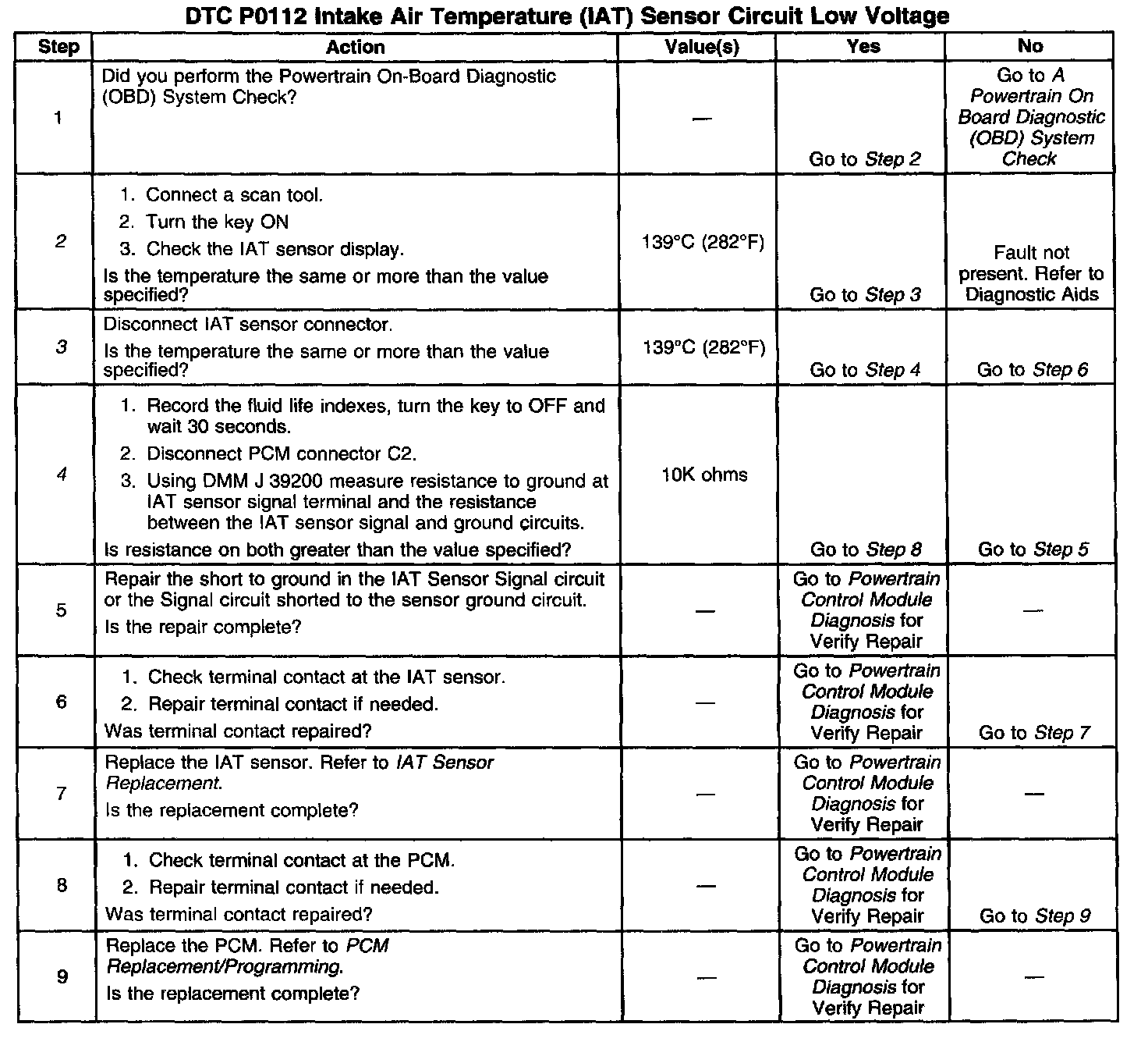 The intake Air Temperature sensor is a thermistor, or variable resistor, that varies resistance based on temperature. As the temperature of the sensor increases, resistance decreases. High temperature will result in low signal voltage. DTC P0112 sets when the PCM sees an IAT sensor reading of 139°C (282°F) when the coolant is less than 110°C (230°F).