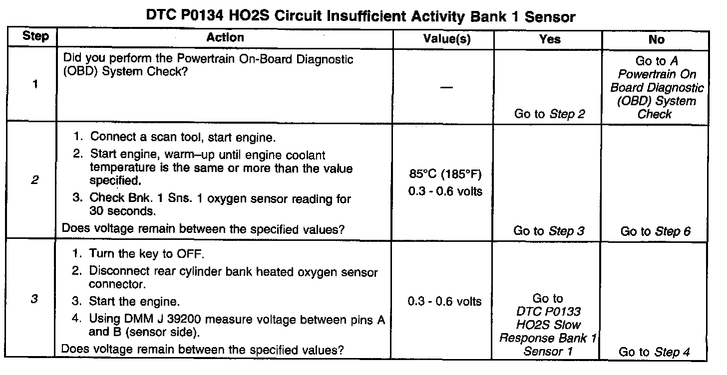 The PCM provides a 0.45 volt reference to the oxygen sensor on CKT 1666. When the Oxygen Sensor reaches operating temperature it will generate a counter voltage that will vary based on the amount of oxygen in the exhaust. The rear heated oxygen sensor is located in the manifold before the catalytic converter. A lean exhaust will generate a low voltage and cause the 0.45 reference to move lower. A rich exhaust will generate a high voltage and cause the 0.45 reference to move higher. If the oxygen sensor cannot respond under the test conditions and generate a voltage greater than 0.609 volt or less than 0.307 volt, it will a set a DTC P0134. Possible causes of DTC P0134 are: