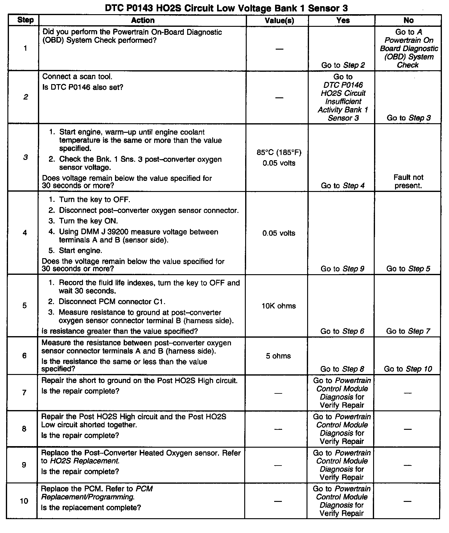The PCM provides a 0.45 volt reference signal to the oxygen sensor on CKT 1668. When the oxygen sensor is cold, below 200°C (392°F), the Oxygen Sensor signal voltage will be around 0.45 volt and the PCM will keep the system in Open Loop operation. DTC P0143 is designed so that if the oxygen sensor stays at a lean voltage for 100 out of 120 seconds during the test conditions, this DTC will set. DTC P0143 will set when: