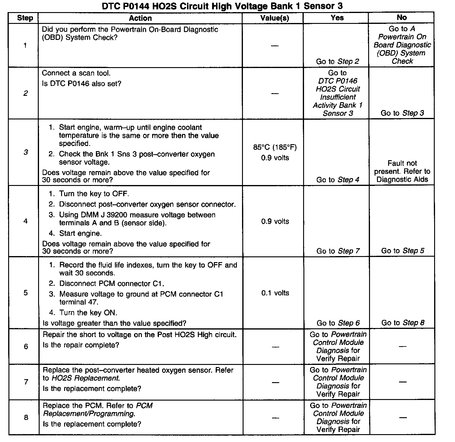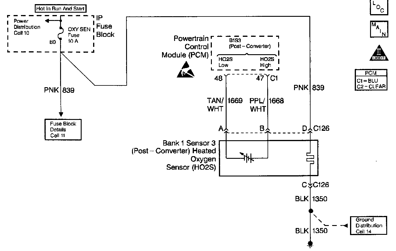 The PCM provides a 0.45 volt reference signal to the oxygen sensor on CKT 1668. When the oxygen sensor is cold, below 200°C (392°F), the oxygen sensor signal voltage will be around 0.45 volt and the PCM will keep the system in Open Loop operation. DTC P0144 is designed so that if the oxygen sensor stays at a rich voltage for 100 out of 120 seconds during the test conditions, this DTC will set. DTC P0144 will set when: