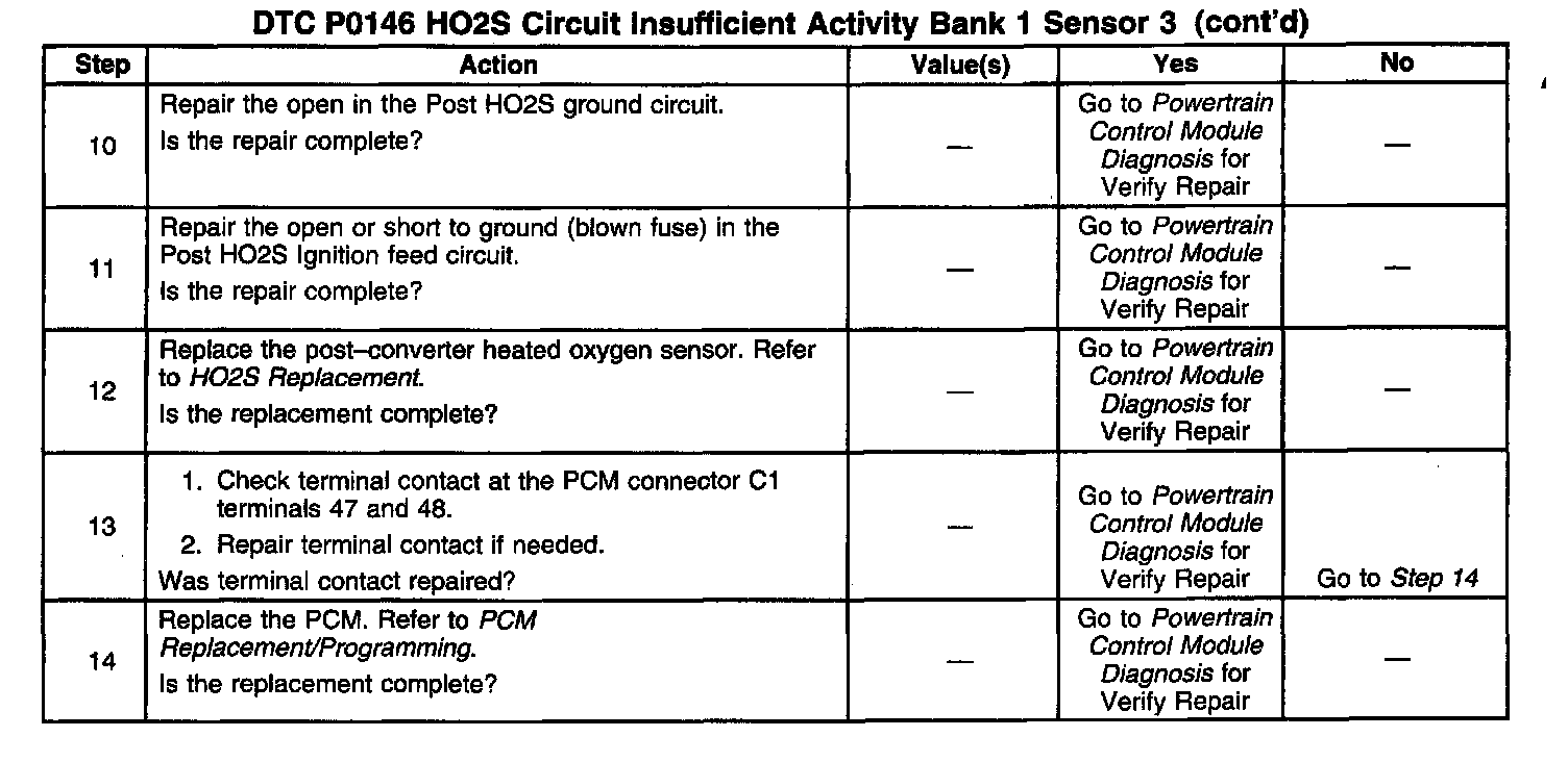 The PCM provides a 0.45 volt reference to the oxygen sensor on CKT 1668. When the Oxygen Sensor reaches operating temperature it will generate a counter voltage that will vary based on the amount of oxygen in the exhaust. The post-converter heated oxygen sensor is located in the exhaust after the catalytic converter. A lean exhaust will generate a low voltage and cause the 0.45 reference to move lower. A rich exhaust will generate a high voltage and cause the 0.45 reference to move higher. If the oxygen sensor cannot respond under the test conditions and generate a voltage greater than 0.609 volt or less than 0.307 volt, it will set a DTC P0146. Possible causes of DTC P0146 are: