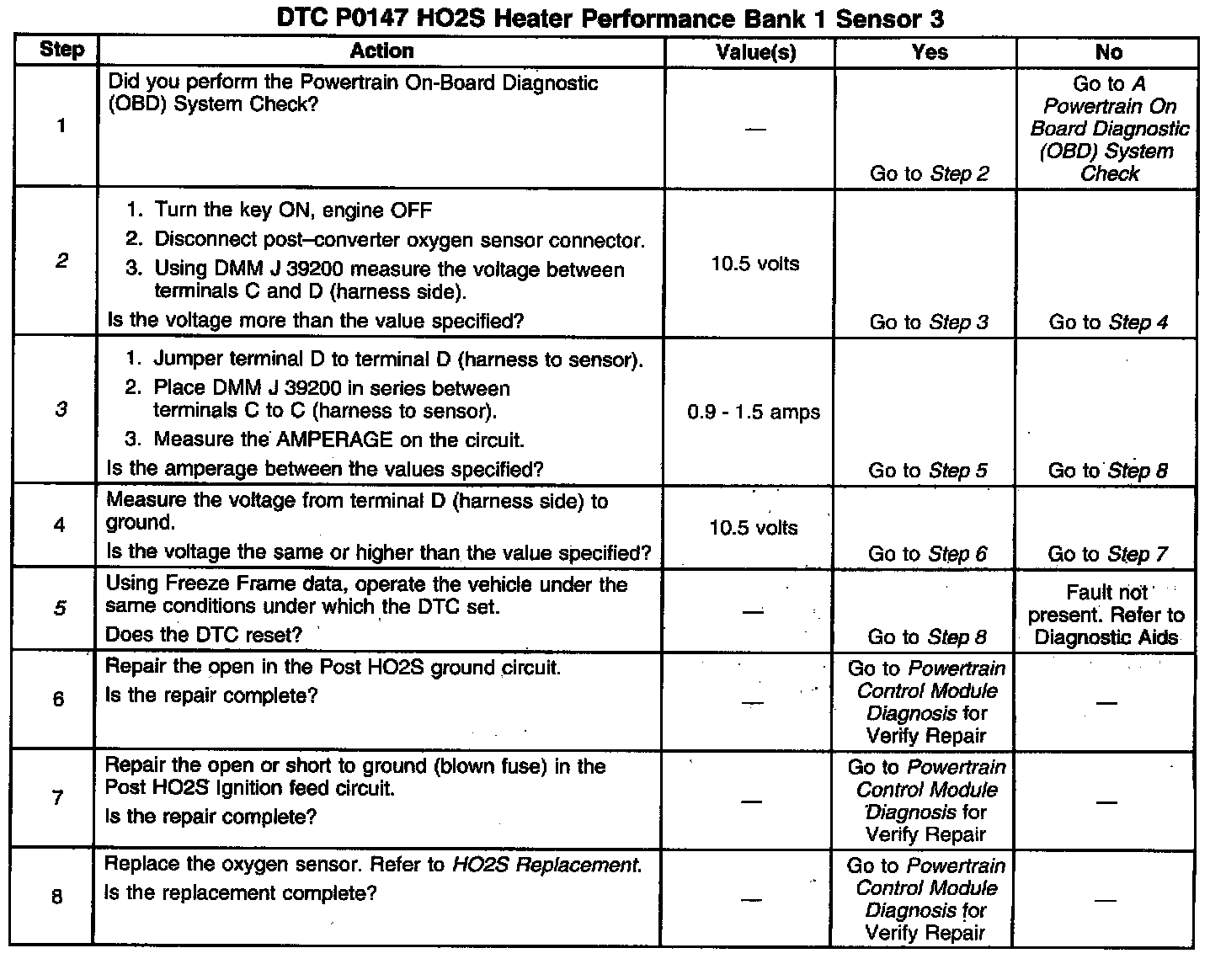 The PCM monitors the post-converter heated oxygen sensor input to determine when its voltage becomes either 151 millivolts less than or 151 millivolts greater than average post-converter heated oxygen sensor bias voltage for 0.1 seconds. If it takes too long, DTC P0147 will set.