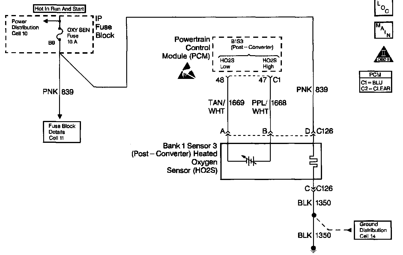 This diagnostic test is used to determine if the heating element in the post-converter oxygen sensor is operating properly. An oxygen sensor acts as a battery because it creates its own voltage once it reaches operating temperature. This voltage is produced when the oxygen content in the exhaust stream is different than that in the atmosphere. The heating element is energized through CKT 839 when the ignition is ON and allows the oxygen sensor to reach operating temperature quickly. This in turn allows the PCM to enter Closed Loop fuel control quicker. When cold, the voltage that the PCM measures on the 02 sensor HI and LOW inputs is called bias voltage. If it takes too long for the 02 sensor to very above or below the bias voltage within a specific time since key ON DTC P0147 will set